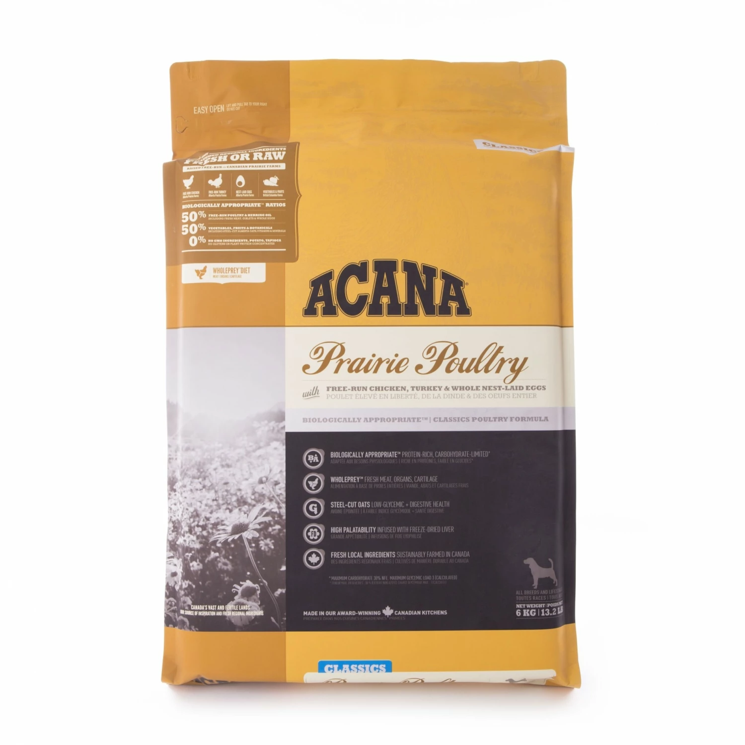 Les croquettes Acana Classics Prairie Poultry sont composées à 50% de viandes et sont adaptées aux besoins physiologiques des chiens, qui sont des carnivores.