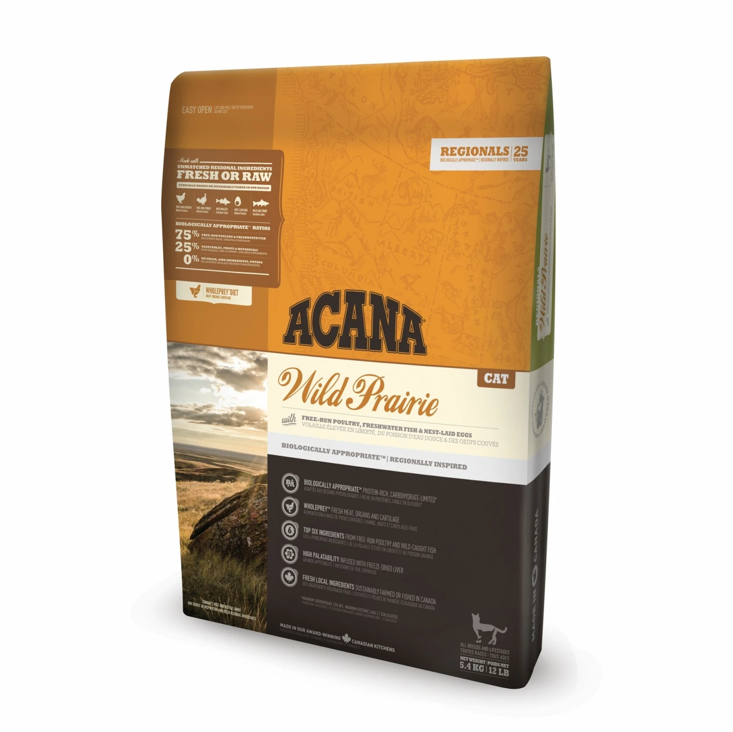 Les croquettes ACANA Regionals Wild Prairie conviennent aux chatons et aux chats adultes. Elles sont riches en protéines et faibles en glucides de façon à se rapprocher du régime naturel des chats. Elles contiennent 75 % de viandes (50% de viandes fraîches et 50% de viandes séchées) certifiées propres à la consommation humaine.