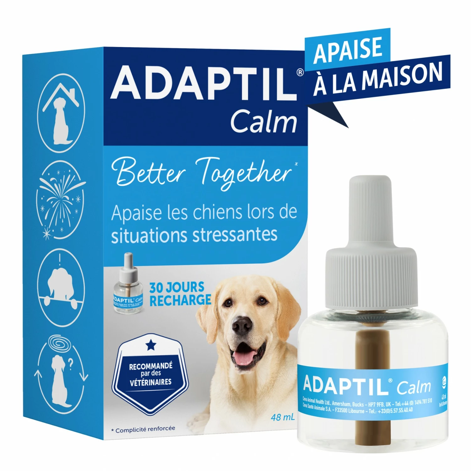 Le diffuseur Adaptil® Calm est un anti-stress pour chien adulte et chiot dont l’action est rapide, prolongée et naturelle. Il aide votre chien à surmonter des situations difficiles et stressantes liées au changement de ses habitudes de vie.