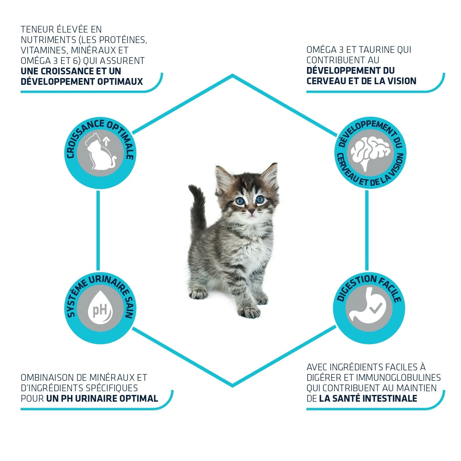 - un bon développement du cerveau et de la vision grâce aux acides gras oméga-3 et à la taurine qui contribuent au développement du cerveau et de la vision