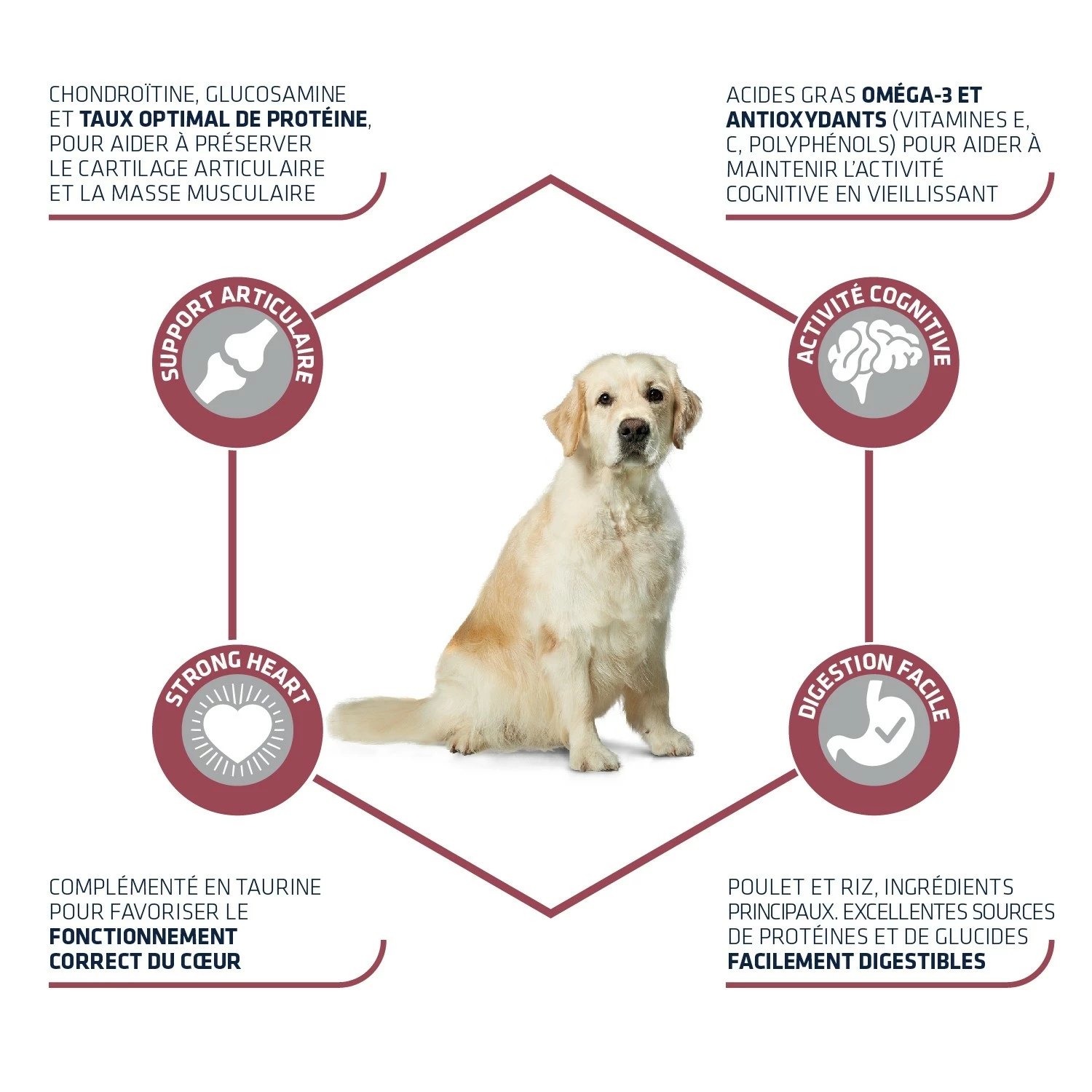- Apporte de la chondroïtine et du glucosamine pour contribuer à préserver le bon fonctionnement des articulations du chien et aider à prévenir d’éventuels problèmes articulaires liés à l’âge,