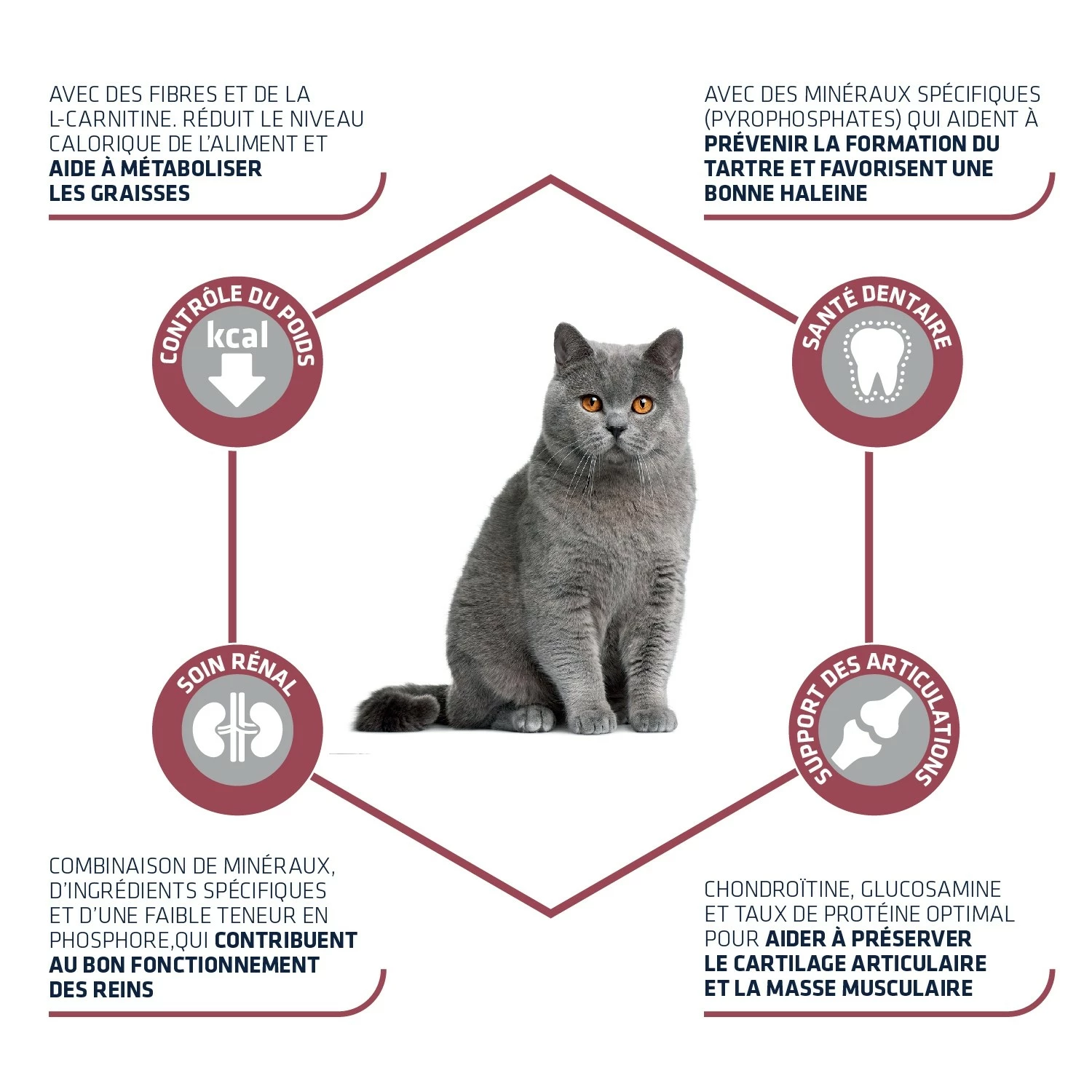 - Aide à diminuer le risque de troubles rénaux grâce à : un niveau réduit de phosphore et un niveau de protéine modéré.