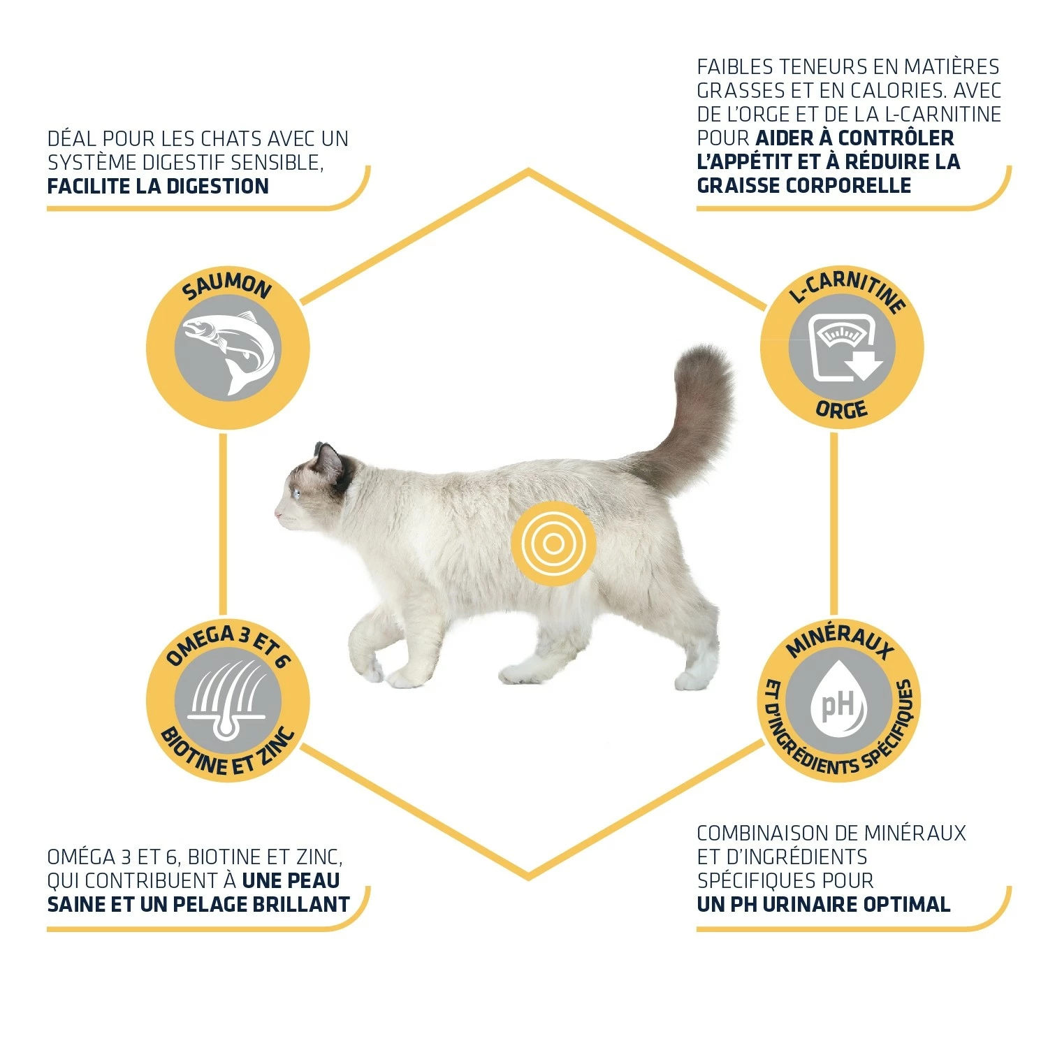 - de biotine et de zinc qui favorisent une peau en bonne santé et un pelage brillant