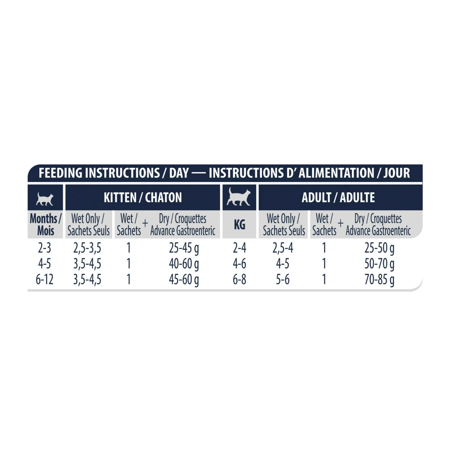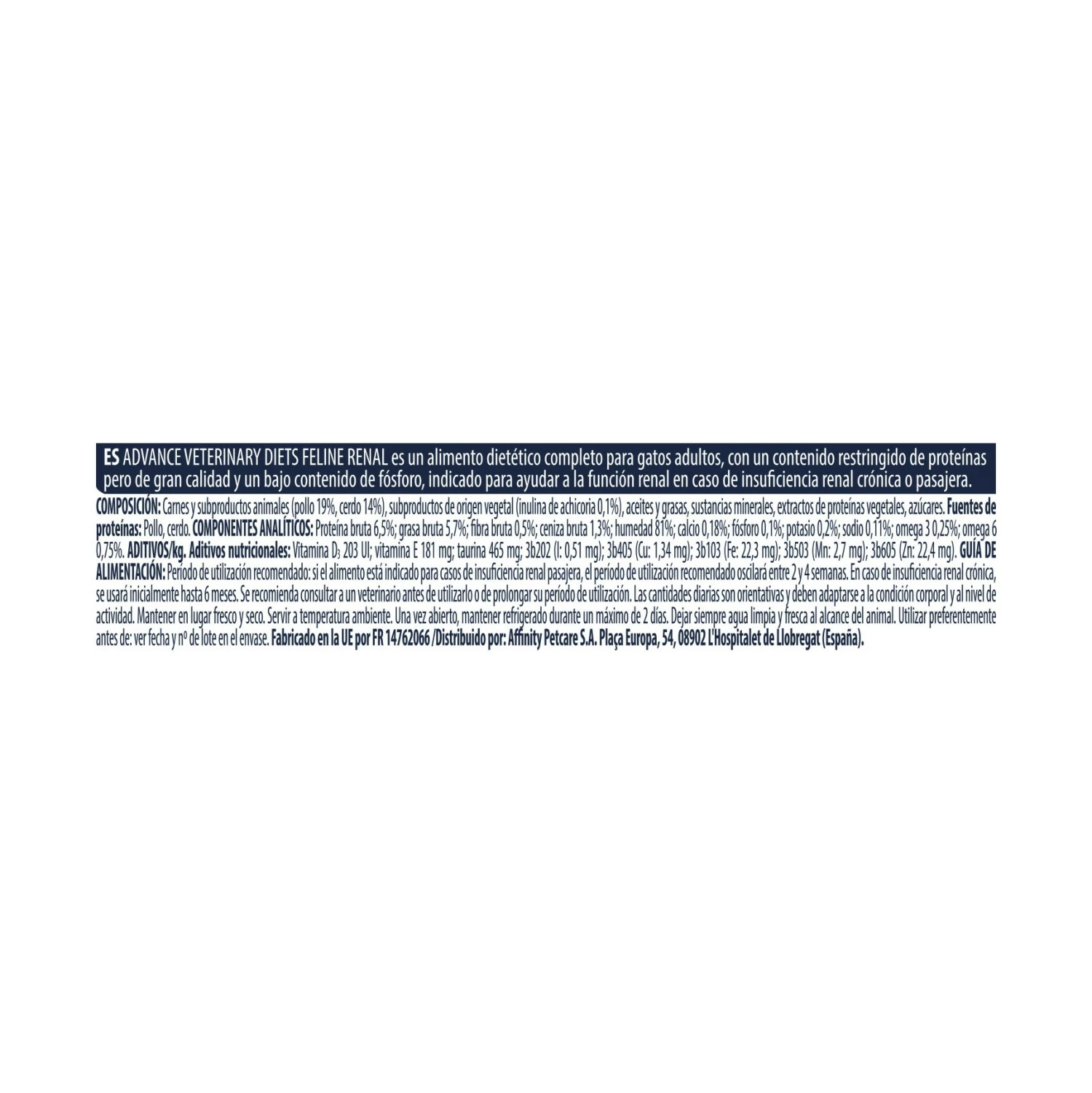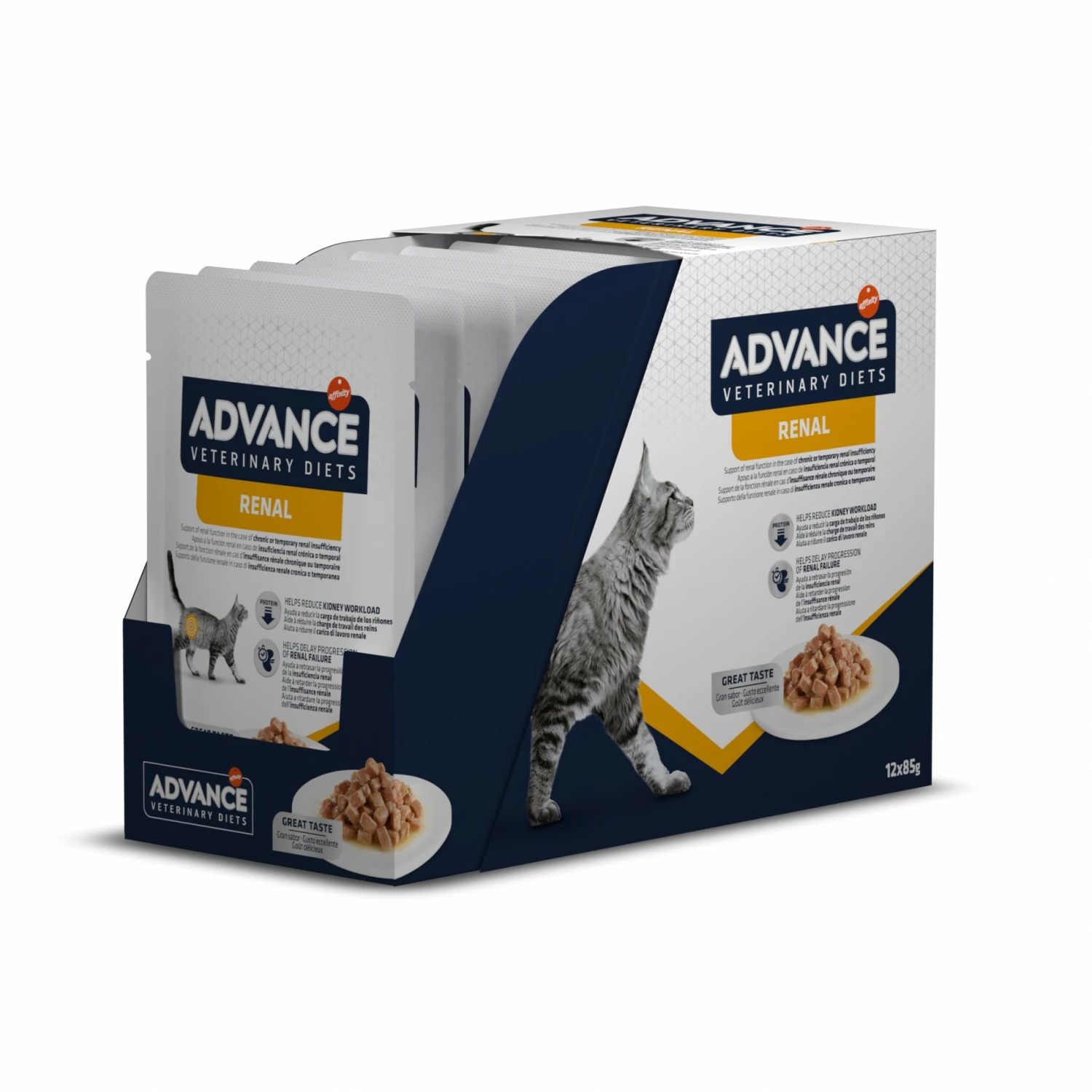 ADVANCE Veterinary Diets Renal est un aliment complet sous forme de pâtée au poulet et au porc en sachet pour chat adulte et senior souffrant d’insuffisance rénale chronique ou temporaire.