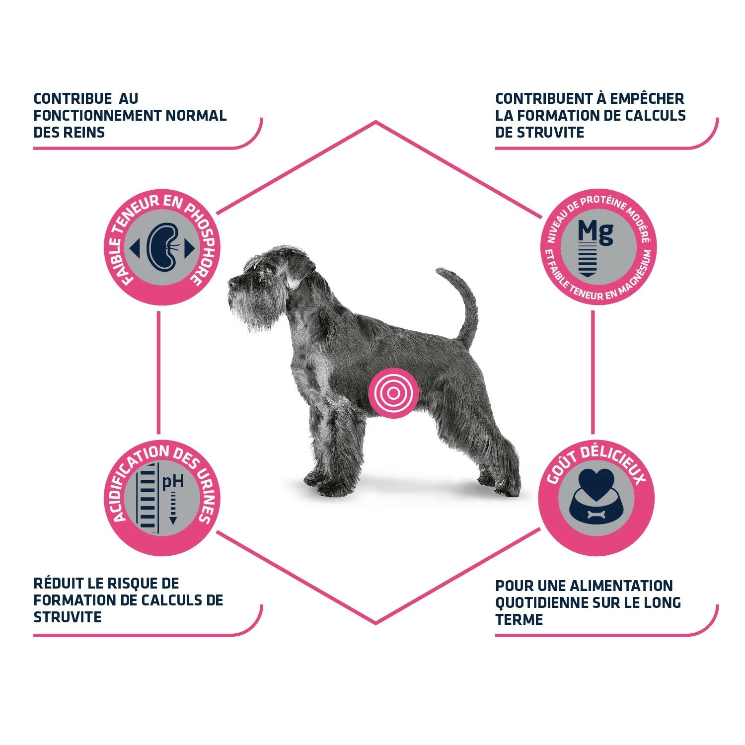 URINARY Canine Formula est un aliment diététique complet et équilibré pour le maintien du chien adulte souffrant de calculs urinaires de struvite grâce à :