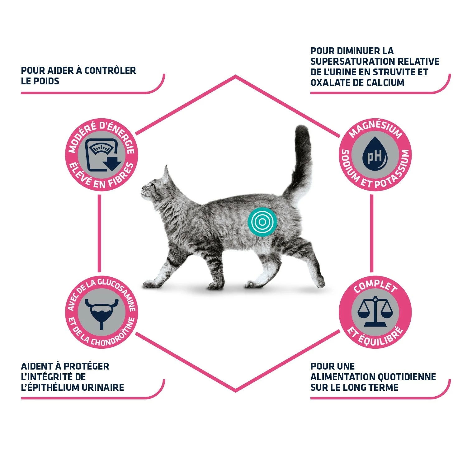 Il est élaboré avec un niveau modéré de magnésium et des propriétés acidifiantes de l’urine, paramètres recommandés pour réduire la réapparition de calculs de struvite dans l’urine de votre chat.