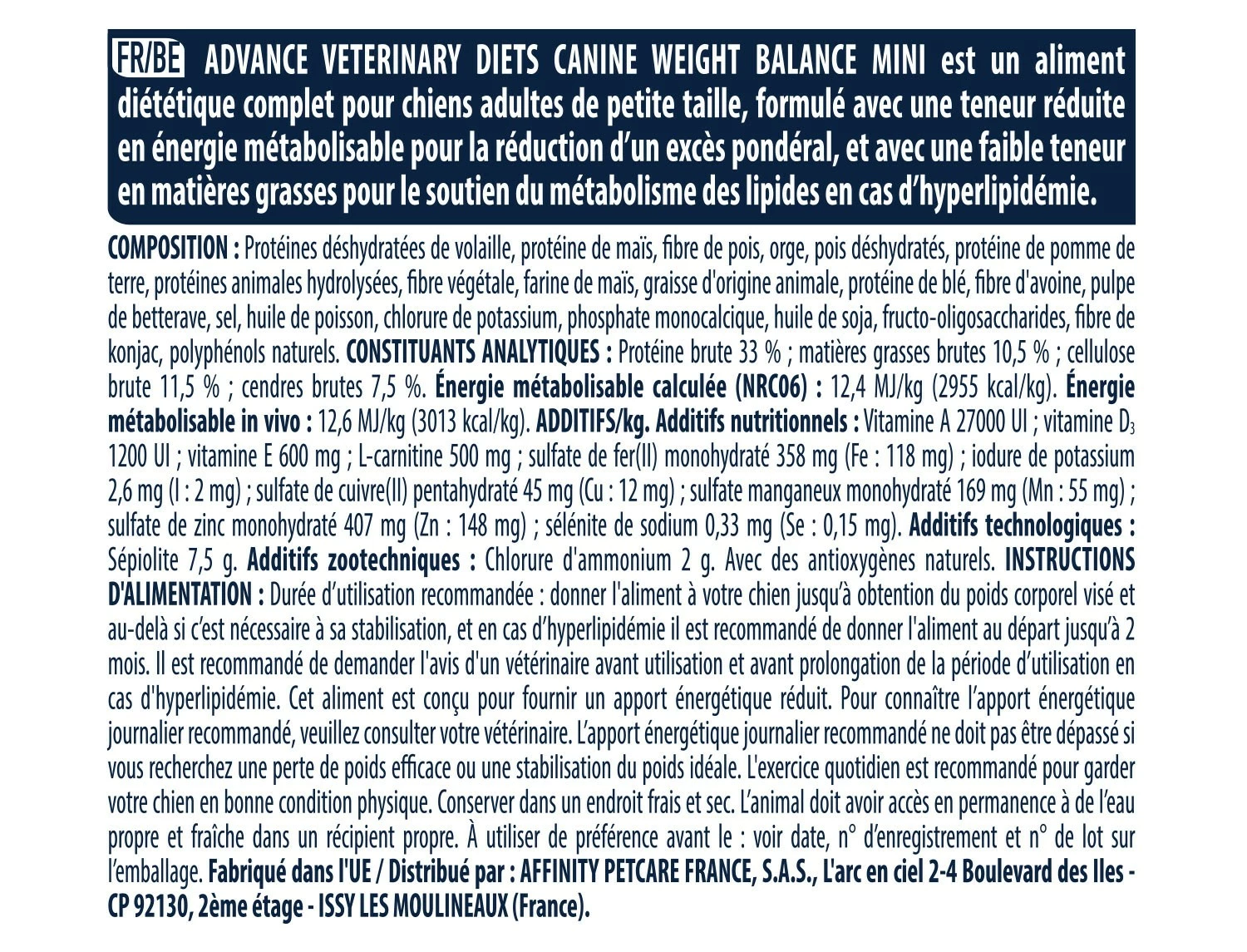 ADVANCE Veterinary Diets Weight Balance Mini est un aliment complet sous forme de croquettes élaboré pour la perte du poids et la régulation du métabolisme lipidique en cas d’hyperlipidémie du chien adulte de petite taille (< 10 kg).