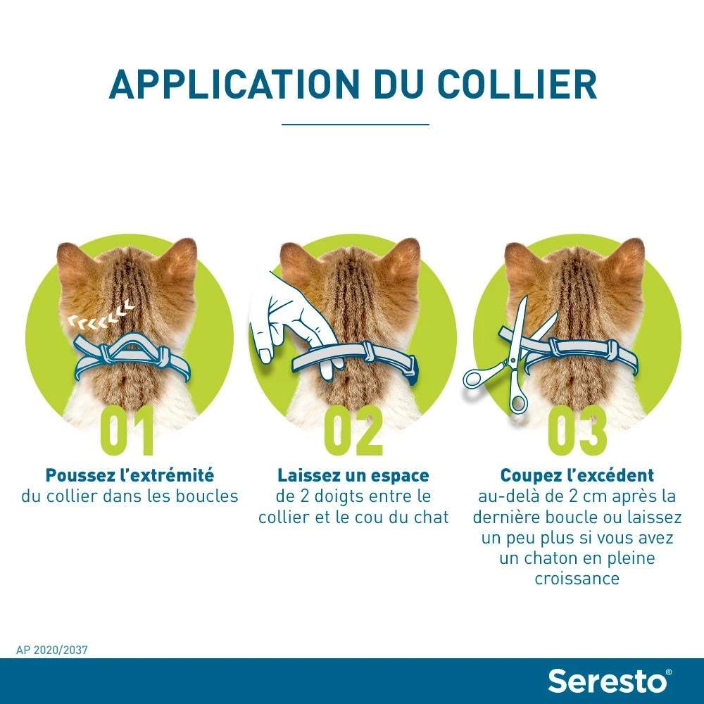 Seresto est un collier antiparasitaire pour les chats de plus de 10 semaines. Il est actif contre les tiques durant 8 mois et contre les puces pendant 7 à 8 mois.