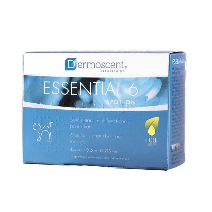 Essential 6 spot-on est un soin multifonctionnel breveté pour chat avec des actifs 100% naturels. Les études cliniques ont démontré qu’Essential 6 spot-on apporte une solution aux problèmes cutanés tels que perte de poils, pelage terne, sec, cassant ou gras, déséquilibre de la microflore cutanée et pelage malodorant. Essential 6 spot-on a six actions principales : hydratante, sebo-regulatrice, anti-squame, désodorisante, réductrice de la perte excessive de poils et anti-radicalaire.
