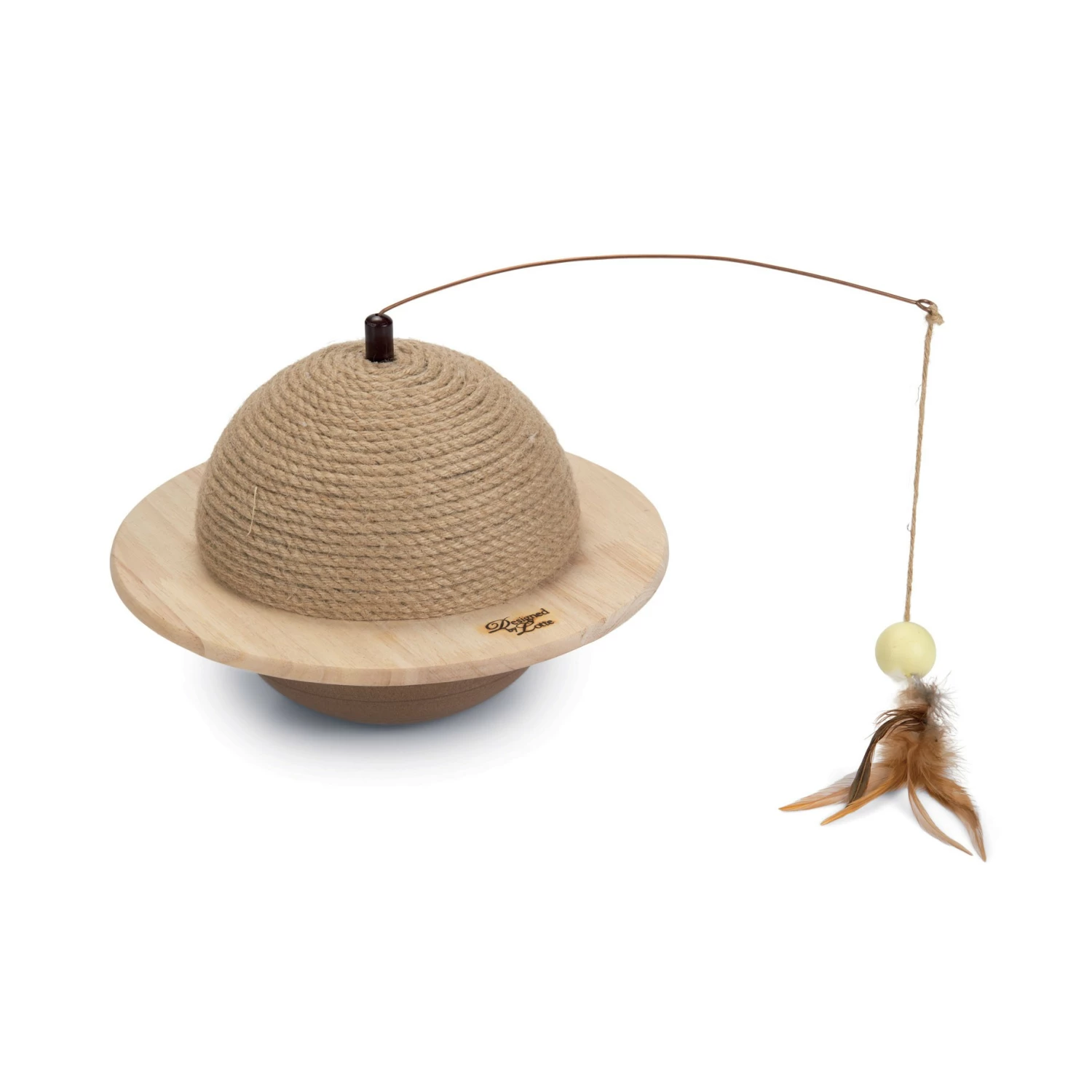 Grâce à sa forme de planétaire, il tourne sur lui-même et bascule à chaque coup de pattes, et la plume accrochée au sommet s’agite en conséquence, pour stimuler son instinct de chasseur.