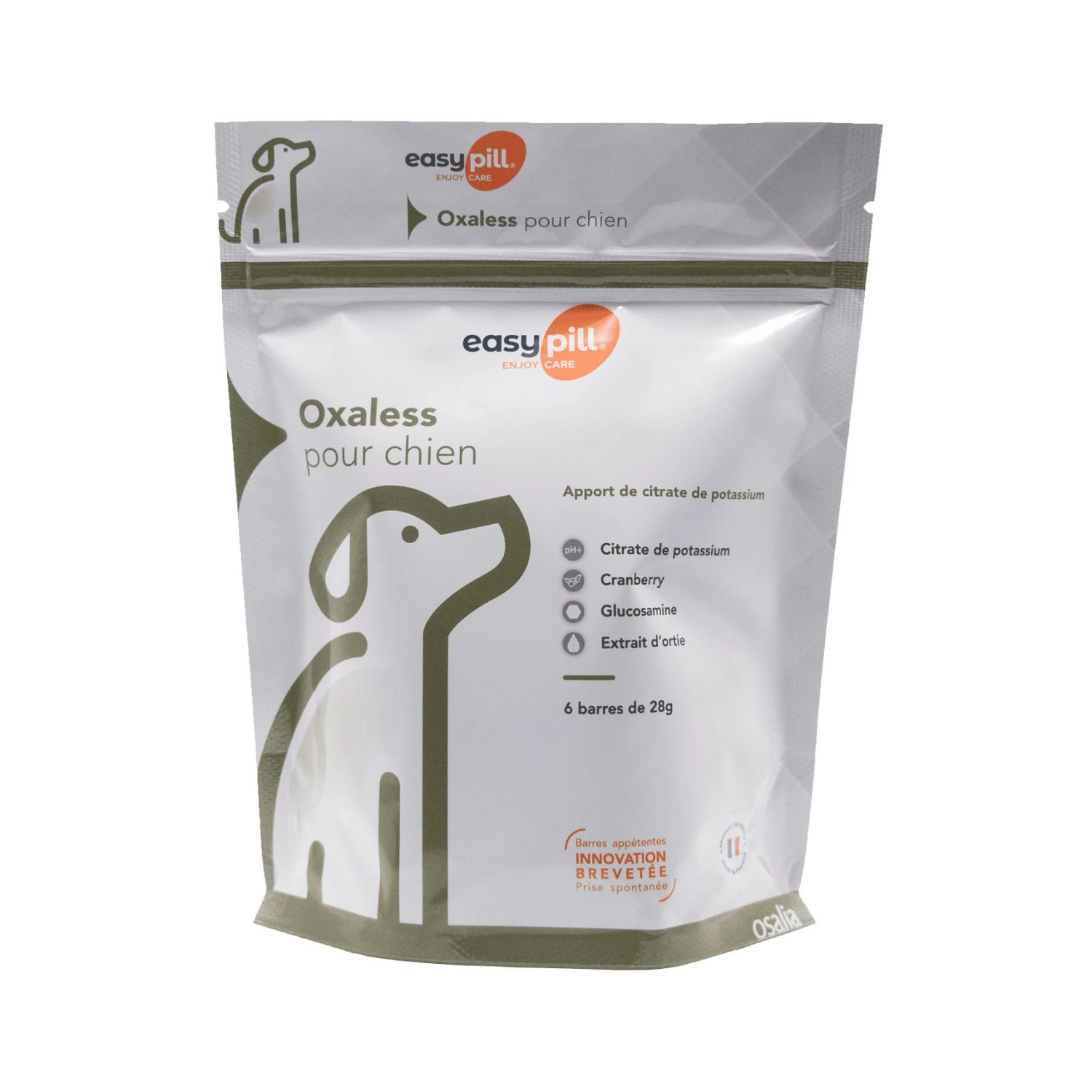 Le complément alimentaire pour chien Easypill Oxaless contient des nutriments réduisant la formation des calculs d’oxalate.