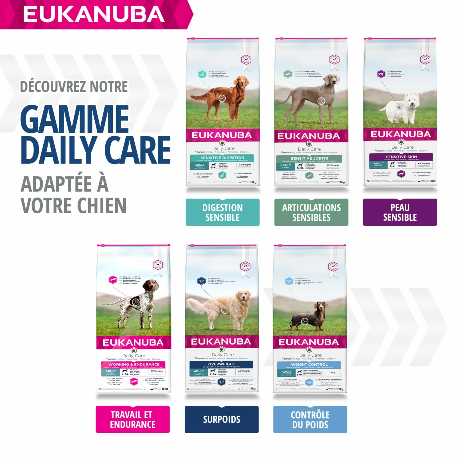 Spécialement adaptées pour les chiens adultes de toutes races en surpoids ou stérilisés, elles contiennent 15 % de matières grasses en moins (par rapport à la recette contrôle du poids) et contient de la L-carnitine qui contribue à la réduction de la masse grasse et à la préservation d’une masse musculaire maigre.