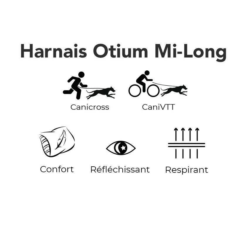 La mise en place du harnais Otium s’effectue facilement par son encolure fixe en forme de V. Celle-ci a aussi pour avantage de libérer la trachée du chien pendant la traction. Le harnais est réglable au niveau des sangles de la cage thoracique pour un ajustement optimal sur le chien.