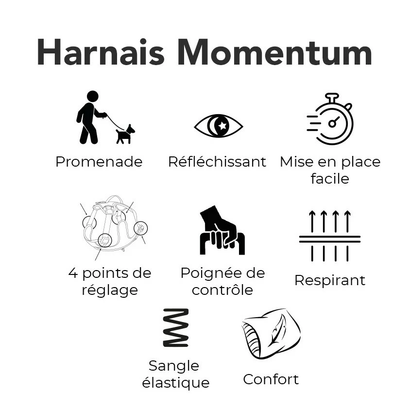Choisisez le harnais de promenade et d’activités plein air Momentum de Kyflie pour partagez des moments de complicité avec votre chien de façon sécurisée, pratique et confortable ! Multifonction, il sera votre meilleur allié !