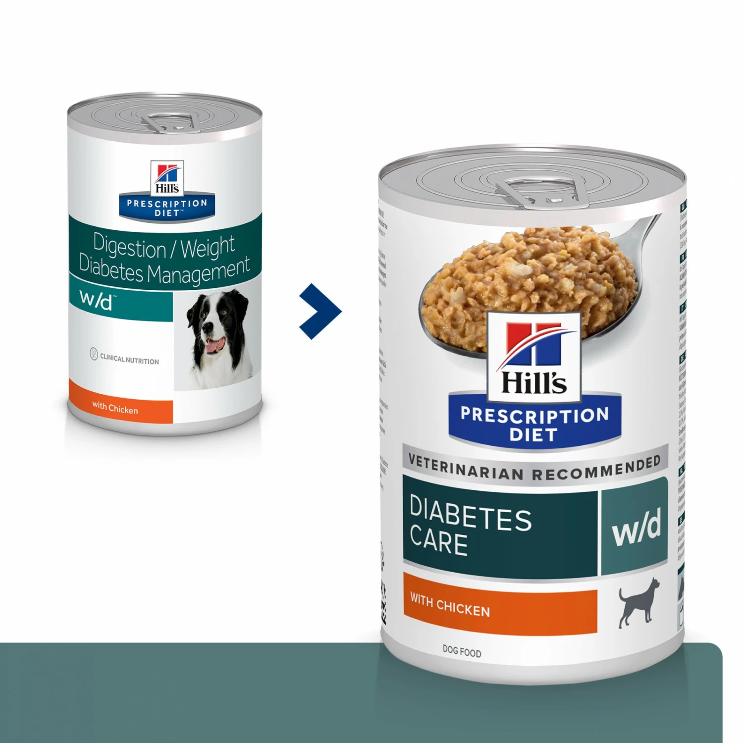 HILL’S Prescription Diet w/d Diabetes Care est un aliment complet sous forme de pâtée en terrine au poulet pour réguler les fluctuations de la glycémie (diabète sucré) chez le chien adulte et senior.