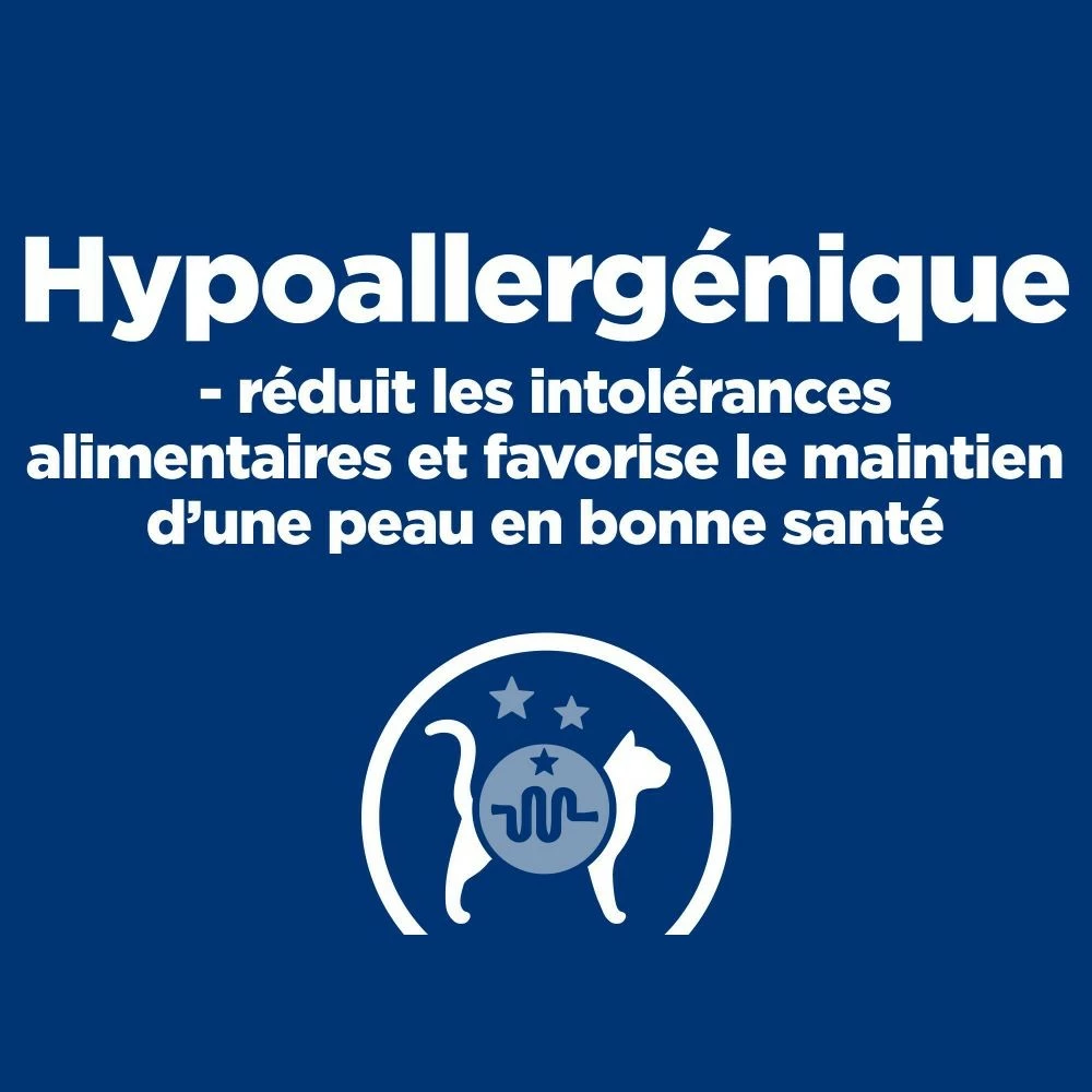L’aliment Hill’s prescription Feline d/d visent au soutien de la fonction dermique chez les chats, liée à des intolérances à certains ingrédients et nutriments de leur alimentation. Cet aliment diététique permet de faciliter la gestion des chats présentant des troubles cutanés, grâce à une teneur élevée en acides gras essentiels et des sources de protéines et d’hydrates de carbone sélectionnées, réduisant les allergènes courants.