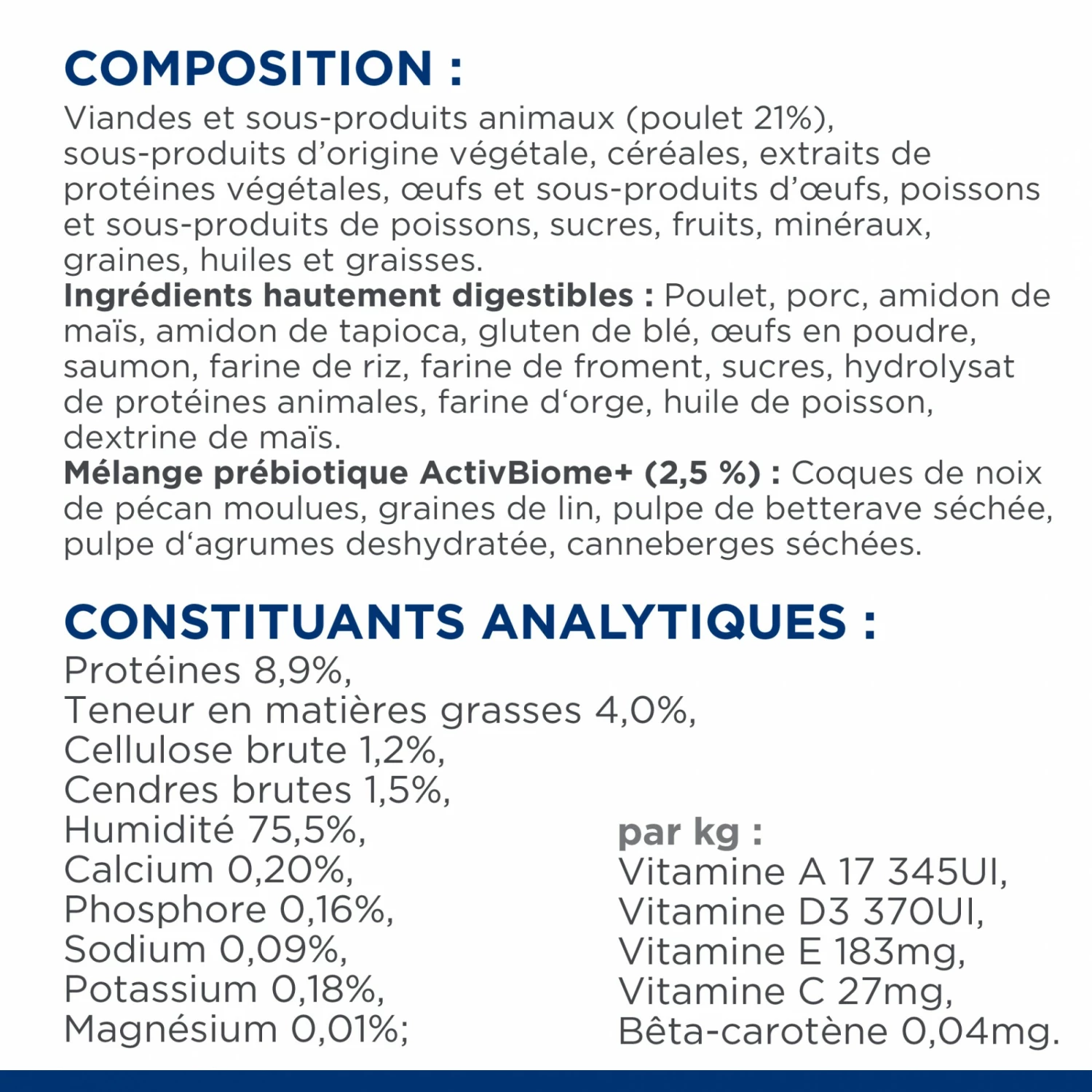 HILL’S Prescription Diet Gastrointestinal Biome existe également en croquettes au poulet et en boîtes de pâtées mijotées au poulet.