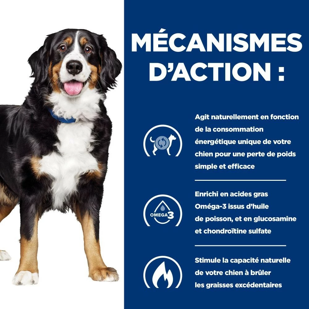 Les aliments Hill’s Prescription Diet Canine Metabolic + Mobility est indiquĂ© pour la santĂ© articulaire et la perte de poids.