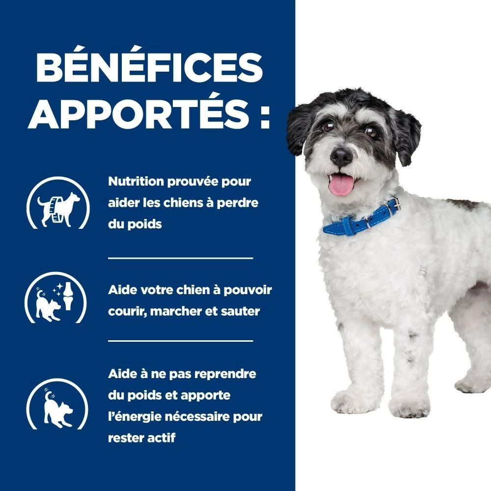 Hill’s Prescription Diet Metabolic+Mobility Mini au Poulet est formulé pour aider votre petit chien à perdre du poids et de manière durable tout en veillant à sa santé articulaire. Les premiers résultats sont visibles en seulement 21 jours.