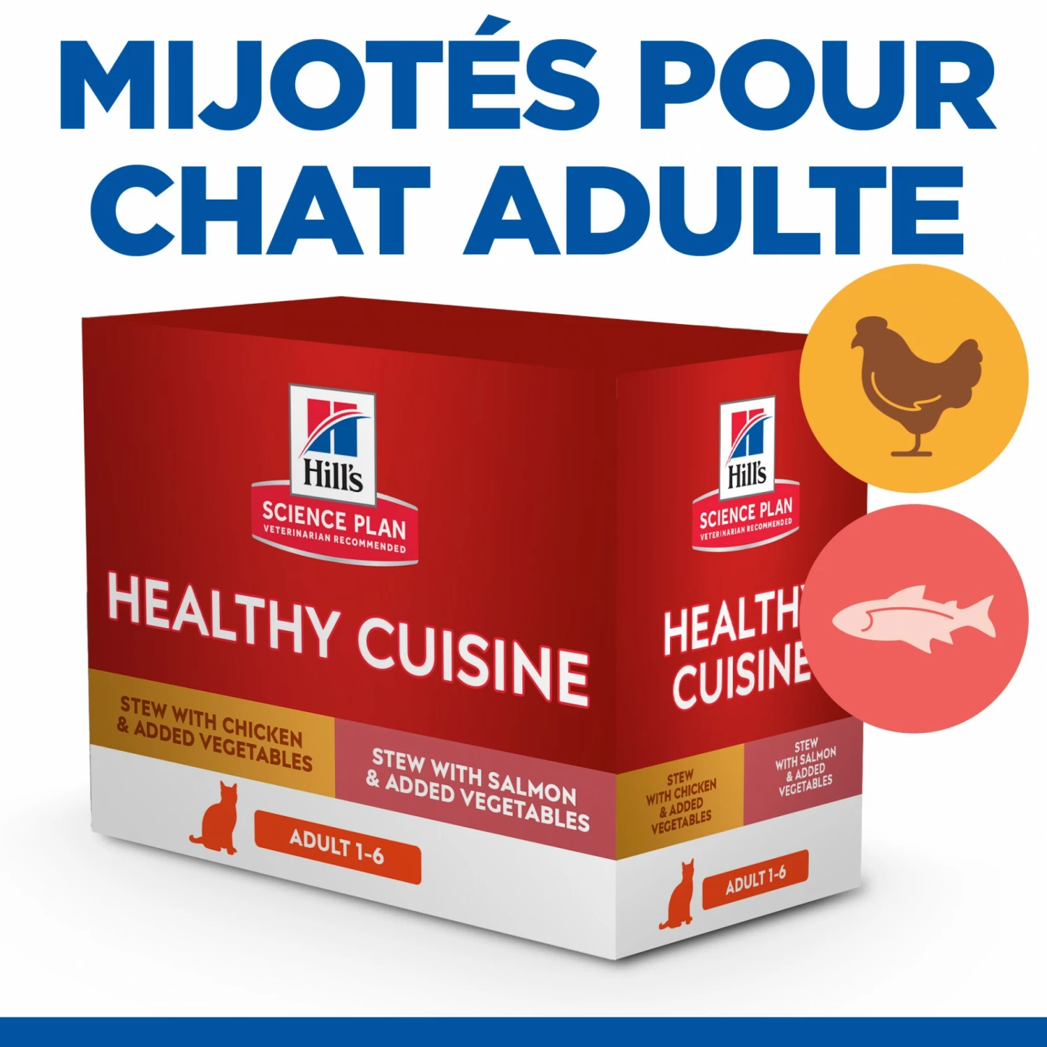 Hill’s Science Plan Healthy Cuisine Adult est un aliment complet sous forme de pâtée mijotée avec des petits légumes pour votre chat adulte de 1 à 6 ans.
