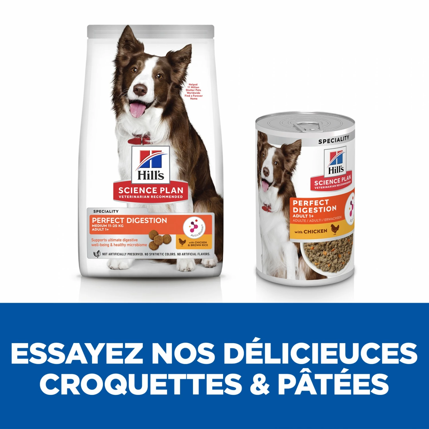 L’aliment complet sous forme de pâtée Hill’s Science Plan Perfect Digestion Adult permet de rétablir et maintenir le bien-être digestif du chien adulte de toute taille de plus d’1 an.