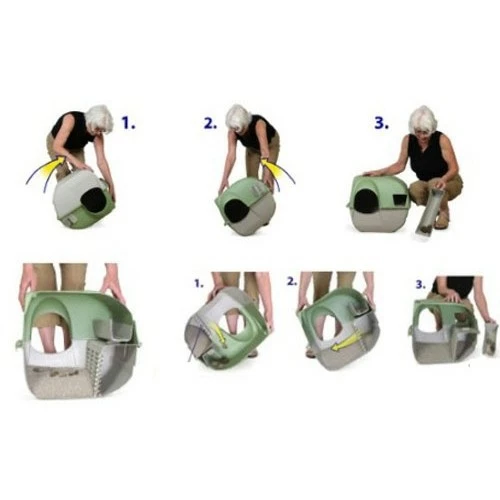 Une poignée située sur le dessus permet de basculer la caisse qui est équipée de bords arrondis tout à fait adaptés à cette fonction. La litière propre est séparée des déchets grâce aux filtres à l’intérieur de la caisse. Il suffit ensuite d’extraire le tiroir disposé sur le coté de la caisse et de vider son contenu (litière et besoins) dans un endroit approprié.