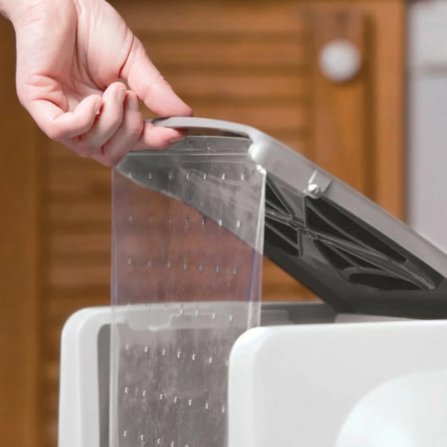 La maison de toilette SmartSift a un filtre à charbon intégré pour absorber les odeurs et une porte battante se refermant par elle-même permet également de limiter les odeurs et la poussière. Les filtres de rechange sont disponibles juste ici.
