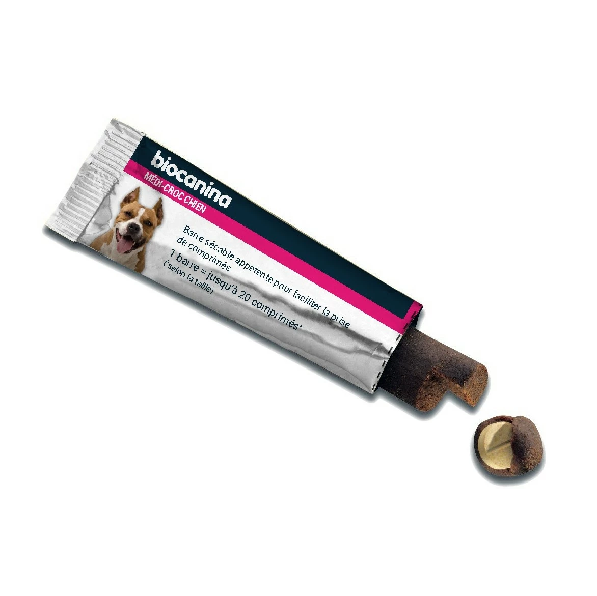 La composition spécifique de cette friandise permet de masquer n’importe quel médicament. Medi-Croc se présente sous la forme d’une barre fractionnable qui permet d’adapter le volume de la boulette à la taille du comprimé.