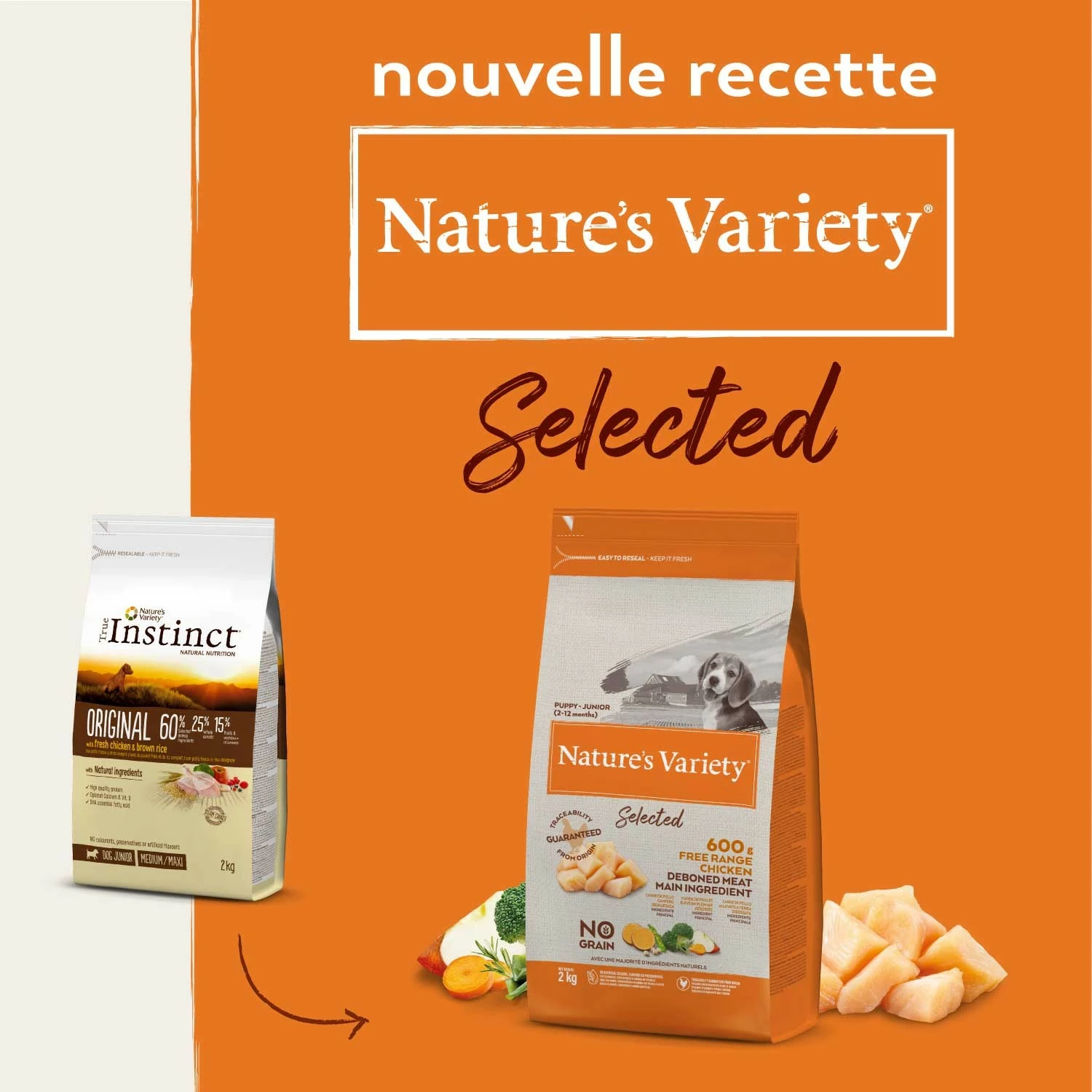 True Instinct Original Medium Maxi Junior devient Nature’s Variety Selected No Grain Junior Poulet. La transition vers les nouveaux emballages et recettes est en cours.