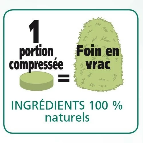 Ce produit est fabriqué grâce à la technologie de compression exclusive pour transformation du foin Western Timothy (trié à la main, 100% naturel) en portions pratiques qui gênèrent 80% de moins de poussière aéroportée que le foin en vrac.