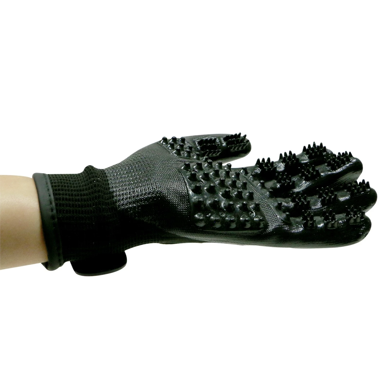 La surface du gant est recouverte de nombreux picots aux différentes formes pour une double fonction : masser votre compagnon pendant son toilettage et faire pénétrer en douceur le shampooing ou le soin au coeur du pelage pour une efficacité renforcée.