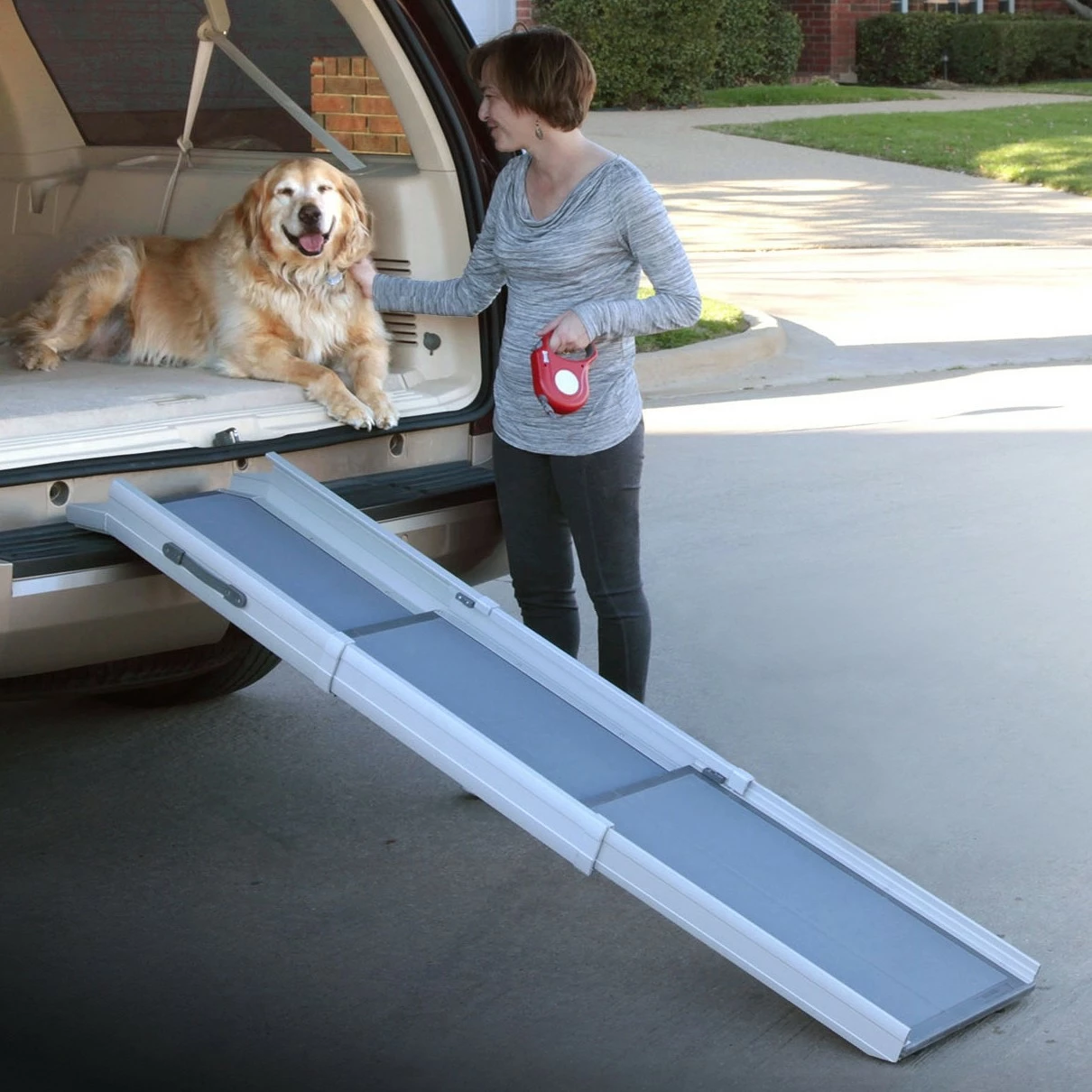 Votre chien a des problèmes de mobilité et vous avez du mal à le faire monter dans votre véhicule ? La rampe téléscopique 3 parties permettra de faciliter la montée et la descente de votre animal et ce sans danger pour ses articulations !