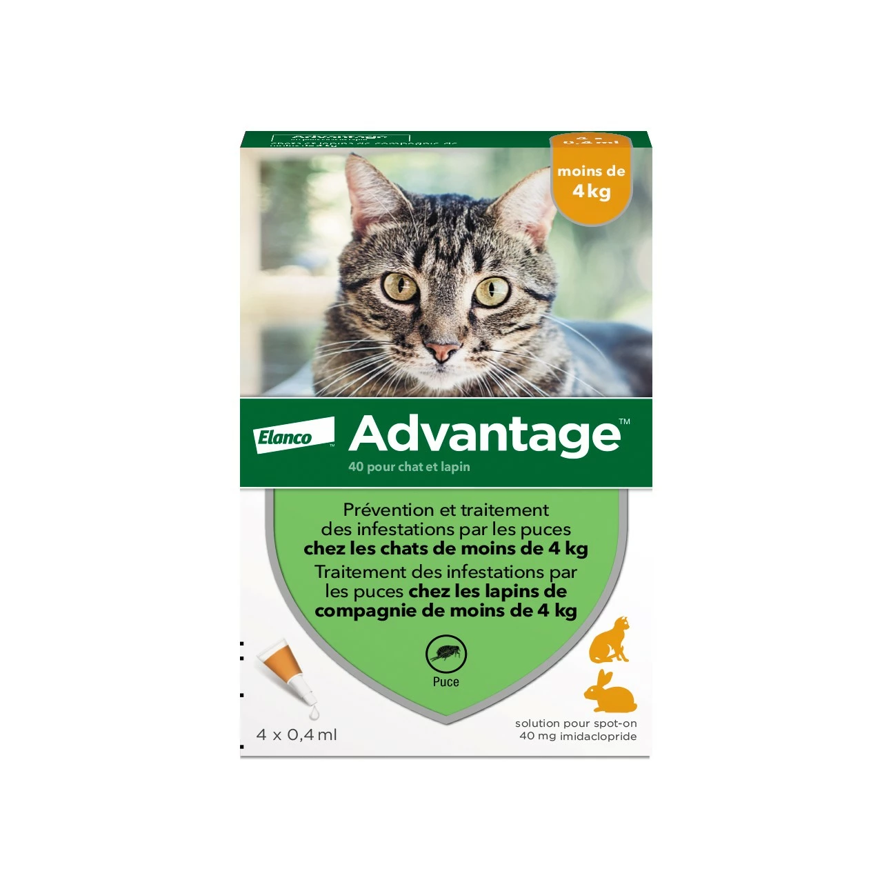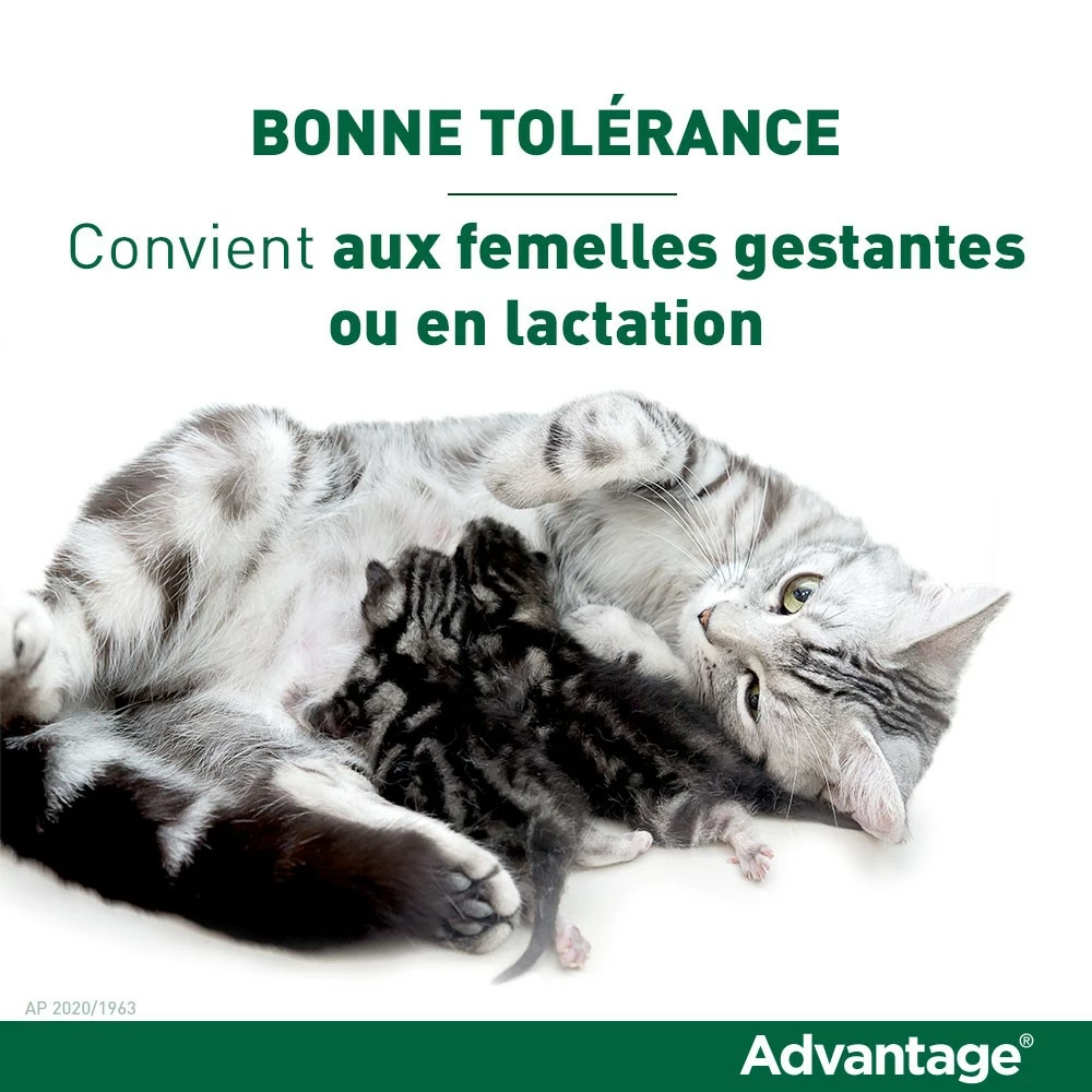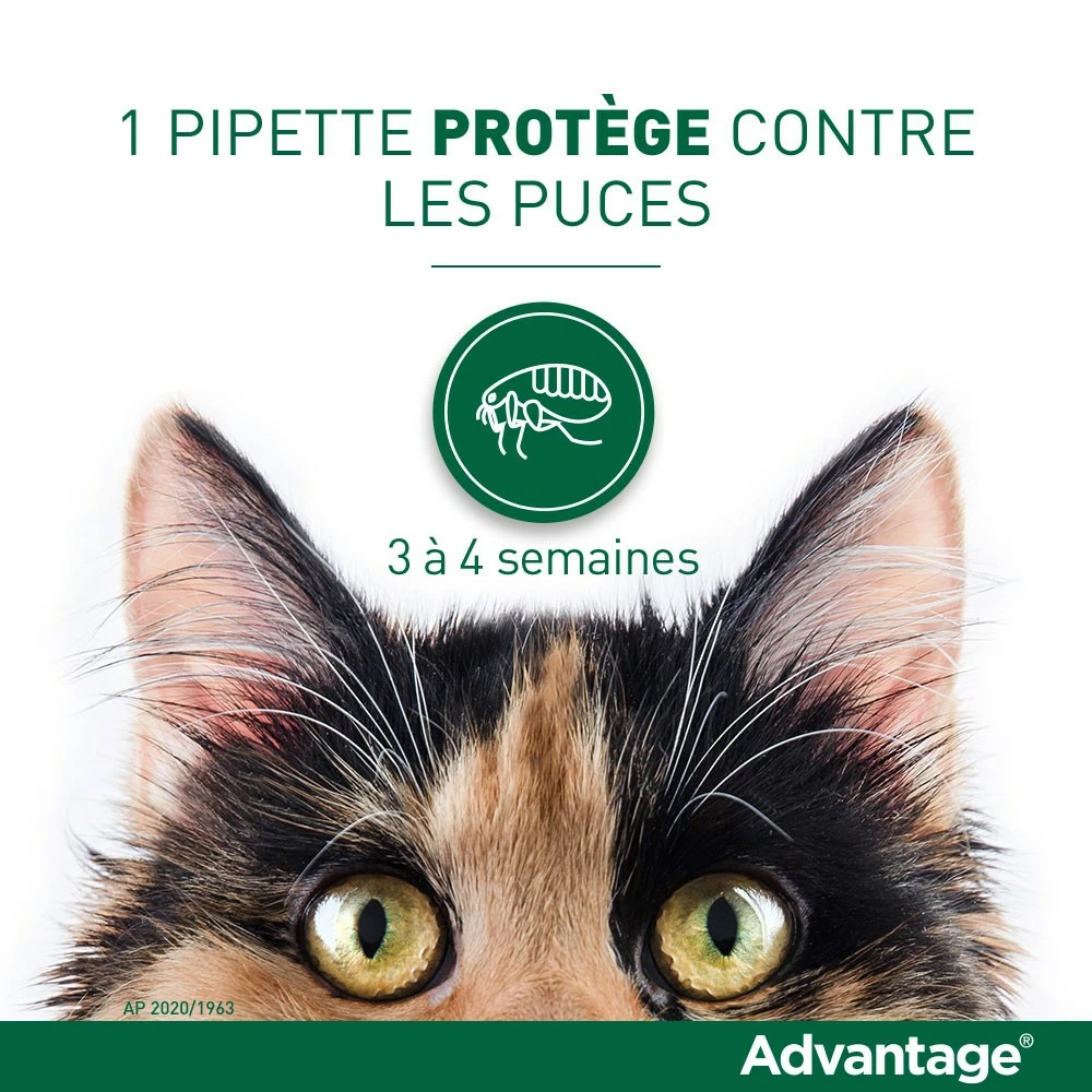 Les pipettes Advantage traitent votre chat contre les puces et préviennent les ré-infestations pendant 3 à 4 semaines. La solution appliquée en un point se répartit sur tout le corps et agit par contact avec les puces.