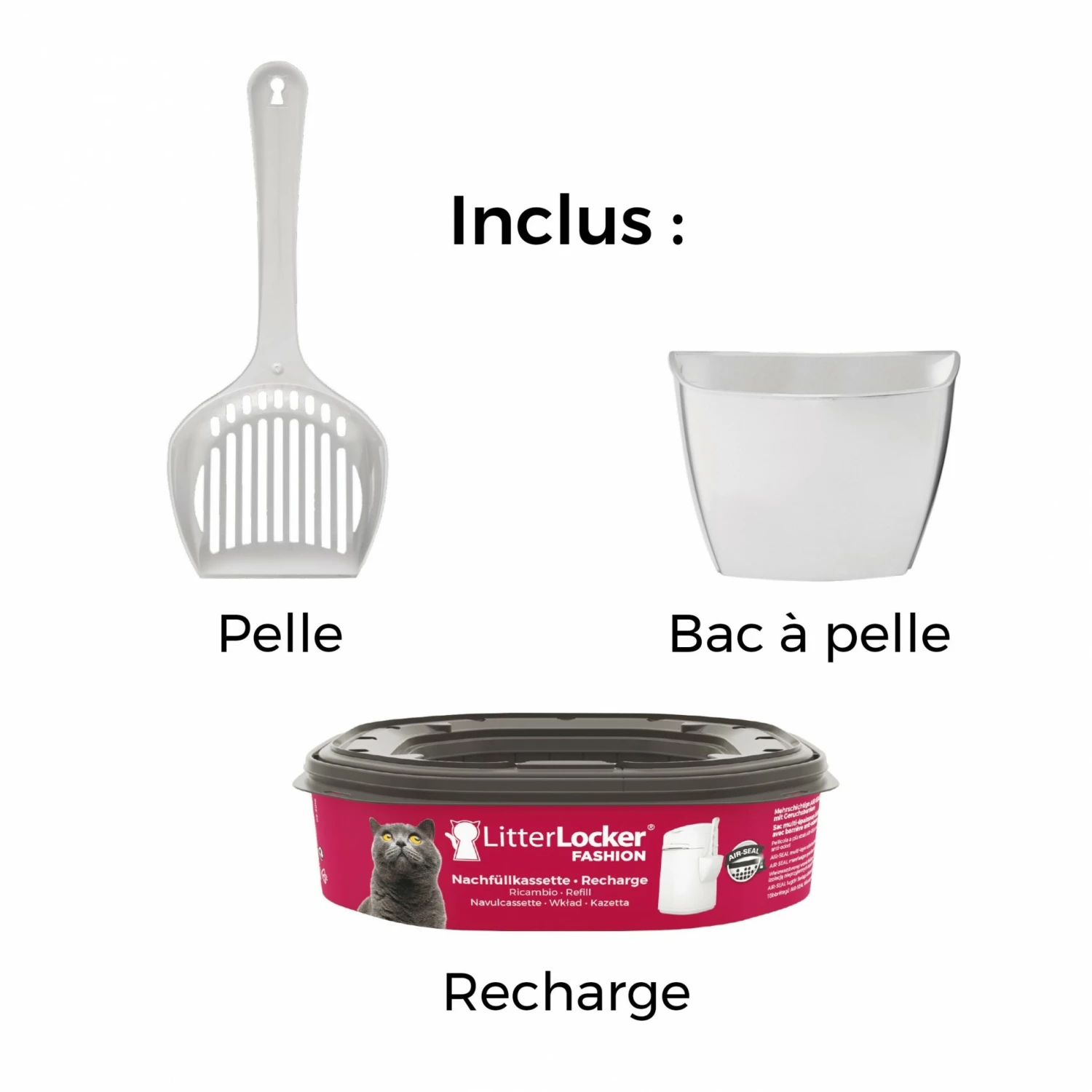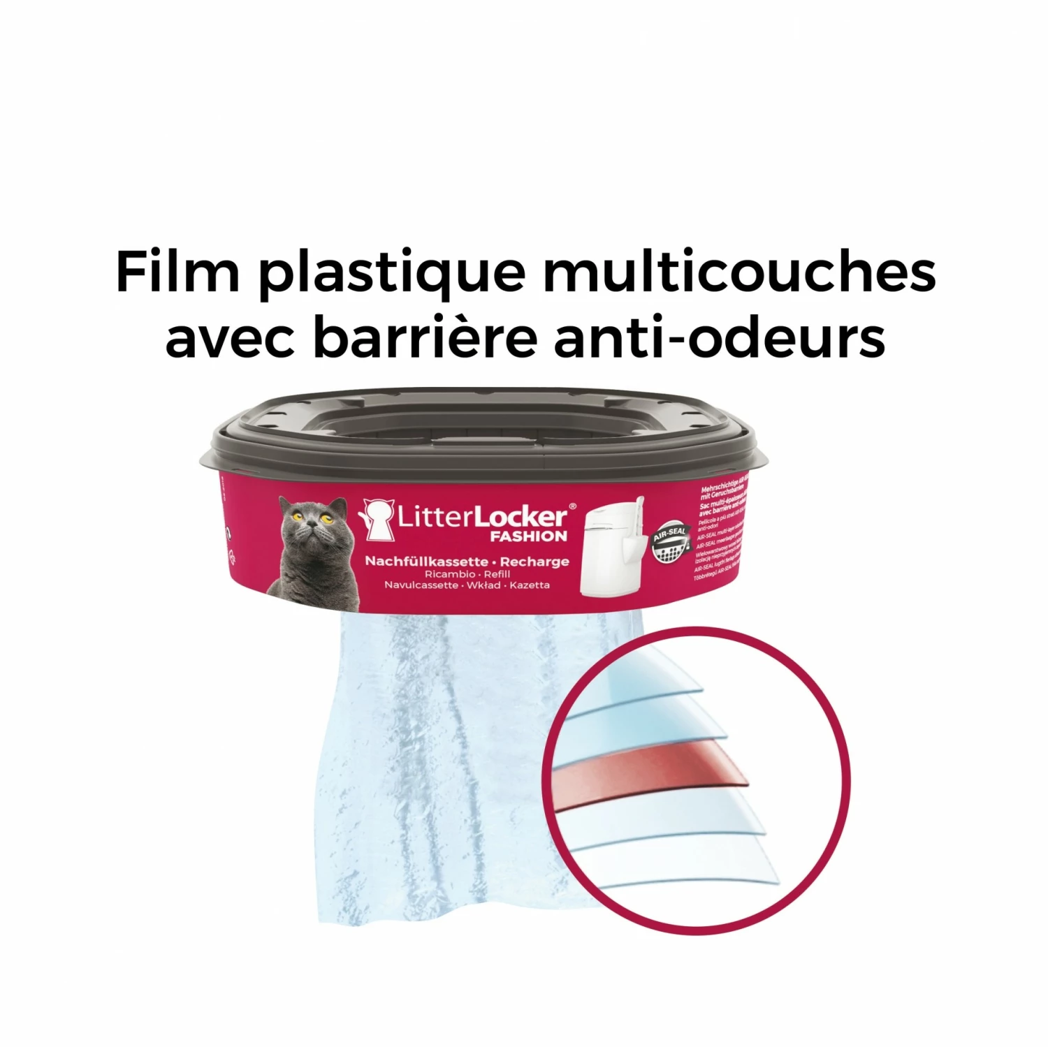 La Litter Locker Fashion peut contenir jusqu’à 2 semaines de litière souillée et chaque recharge dure environ 2 mois pour un chat.