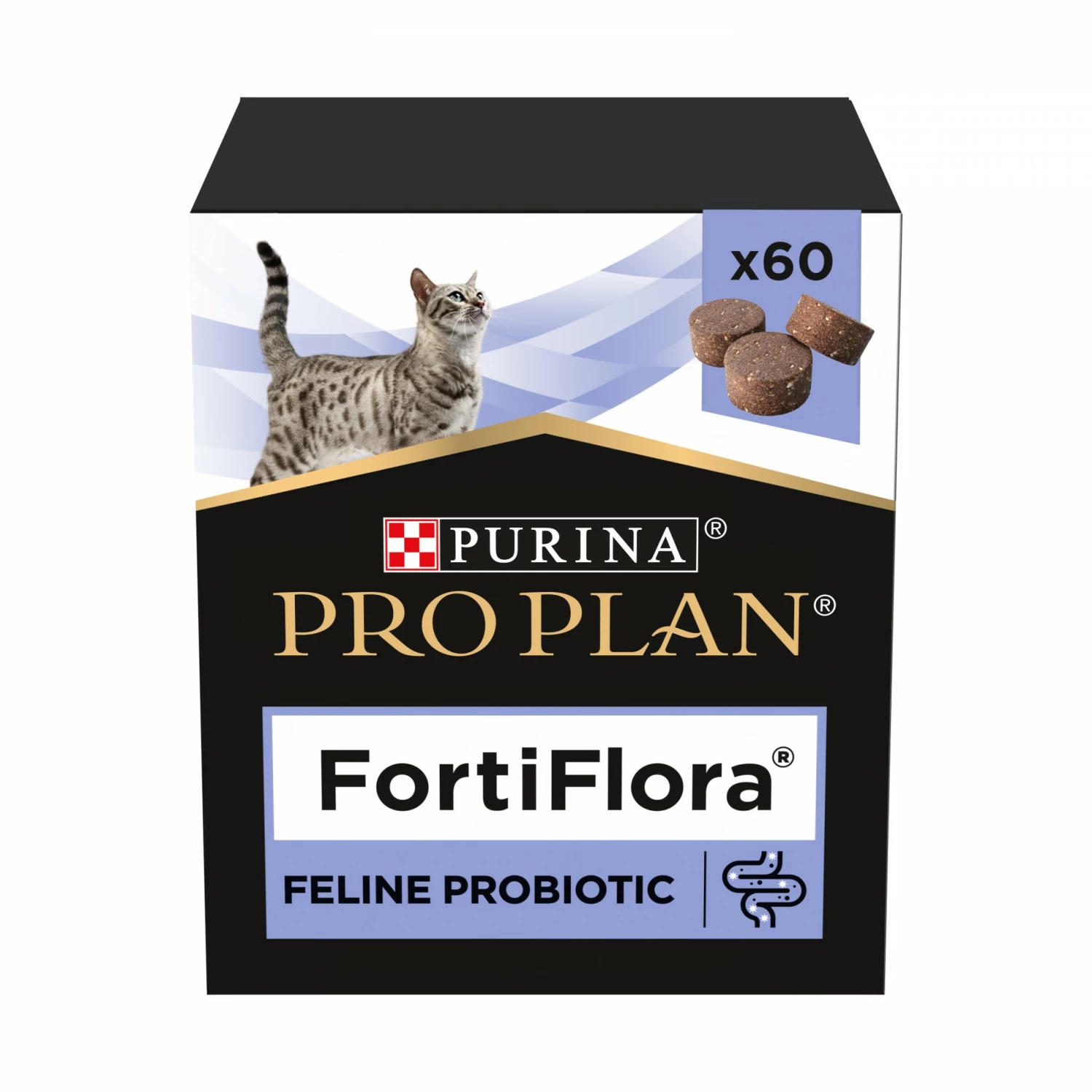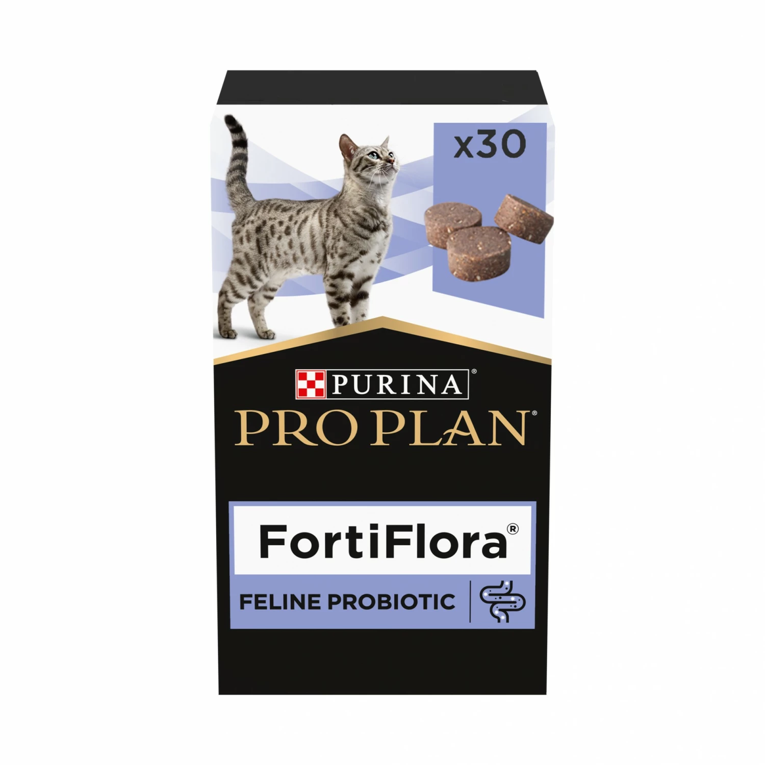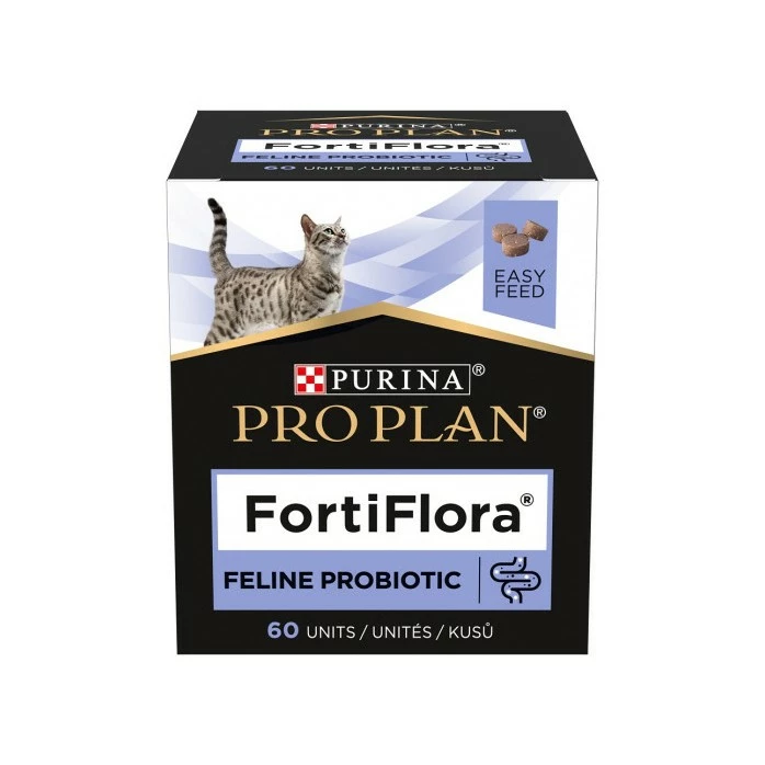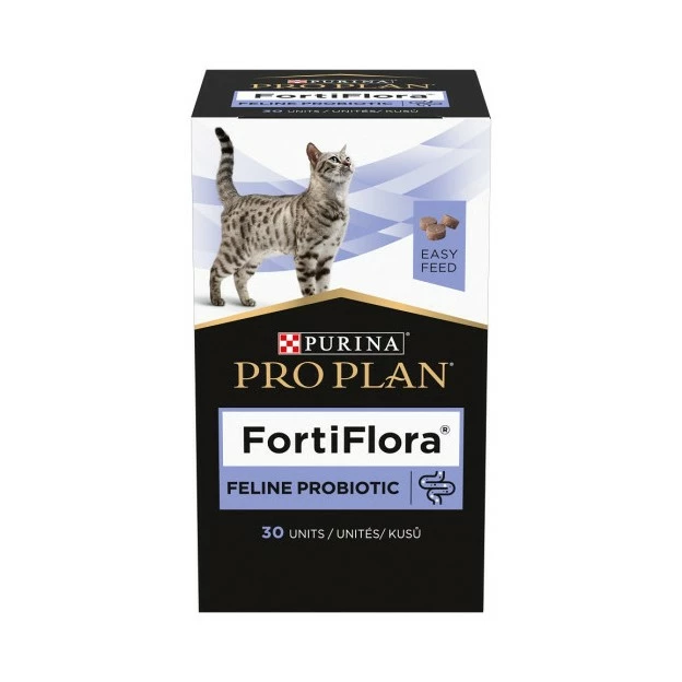 Pro Plan FortiFlora est un aliment complémentaire probiotique sous forme de savoureuses bouchées pour le chat de tout âge ayant des troubles de la digestion.