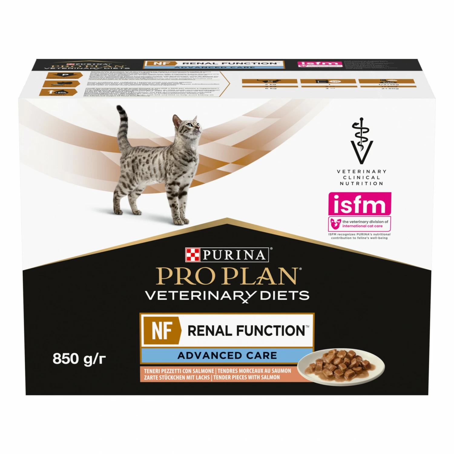 Pro Plan Veterinary Diets NF Renal Function Advance Care est un aliment complet sous forme de sachets de pâtée en tendres bouchées pour chat souffrant d’insuffisance rénale chronique.