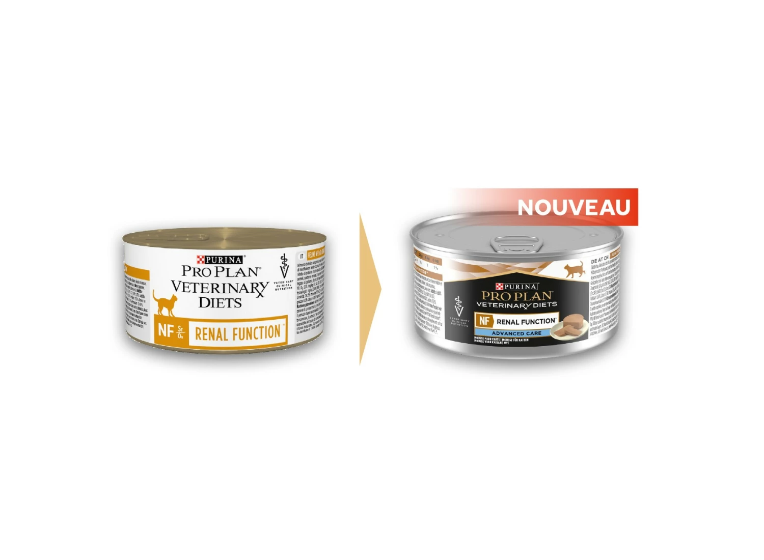 Pro Plan Veterinary Diets NF Renal Function Advance Care est un aliment complet sous forme de boîtes de pâtée en mousse pour chat souffrant d’insuffisance rénale chronique.