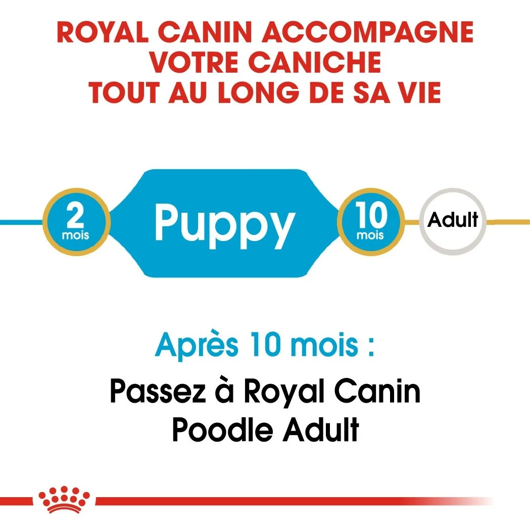 Les croquettes ROYAL CANIN® Poodle Puppy sont spécialement conçues pour répondre aux besoins nutritionnels de votre chiot de race Caniche, âgé entre 2 et 10 mois.