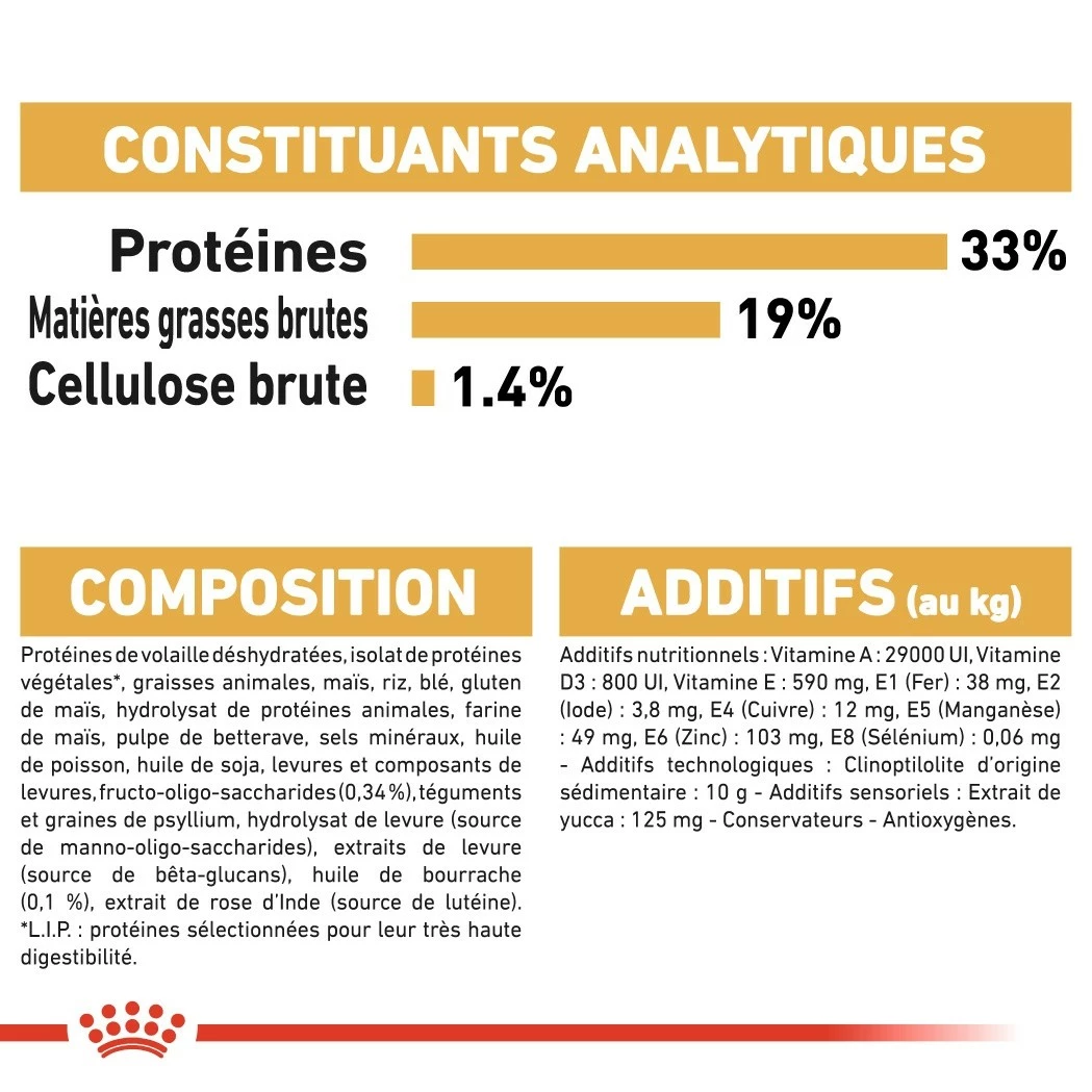 - maintenir un bon équilibre de la flore intestinale ainsi qu’une bonne santé digestive grâce à des protéines et des prébiotiques à haute digestibilité