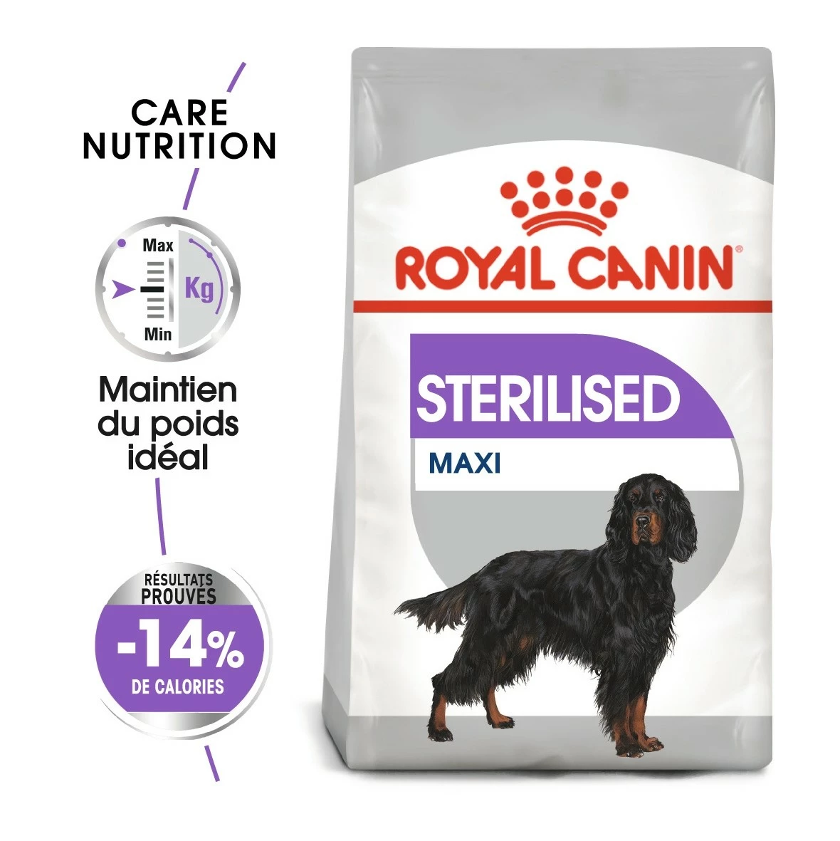 ROYAL CANIN® Sterilised Maxi convient aux chiens adultes stérilisés de plus de 15 mois et pesant entre 26 à 44 kg.