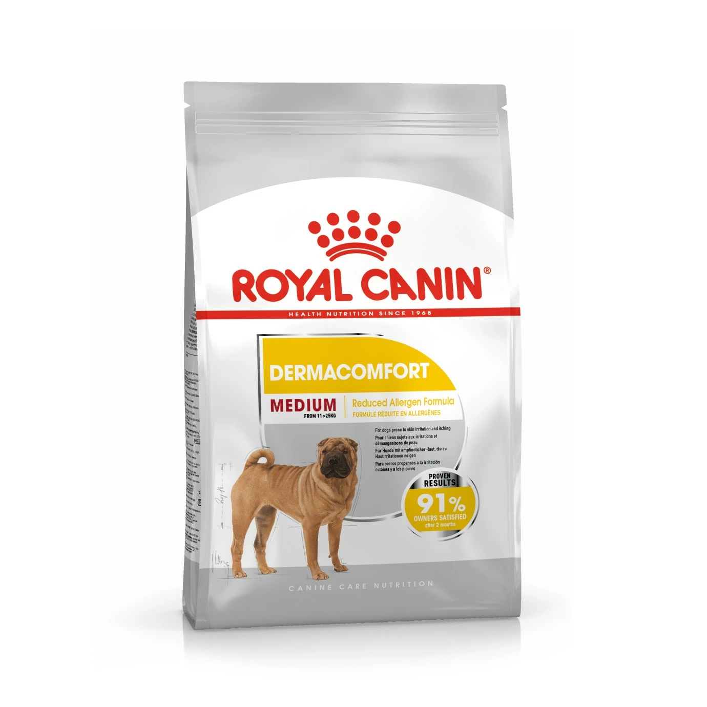 ROYAL CANIN® Dermacomfort Medium convient aux chiens de taille moyenne, âgĂ©s de plus d’un an, pesant entre 11 et 25 kg.Â
