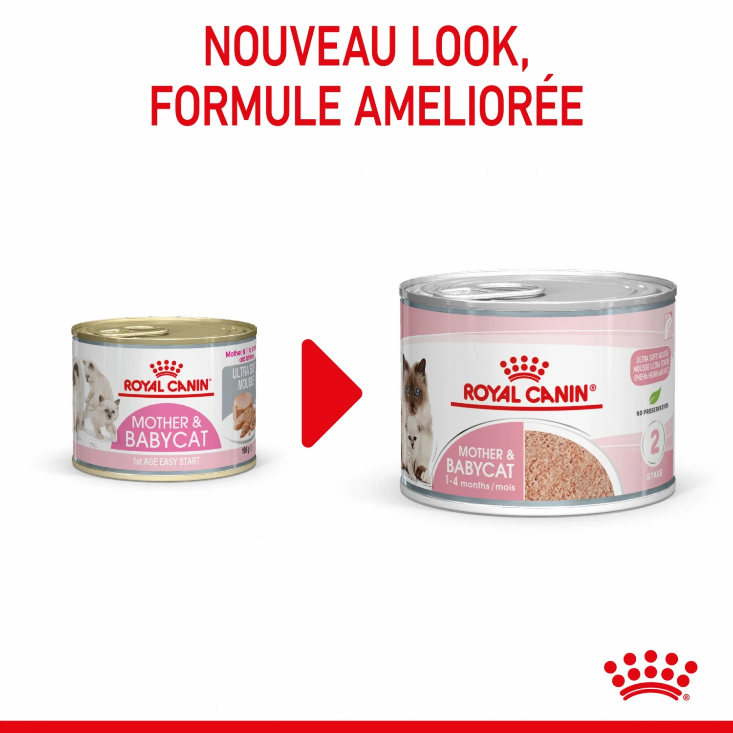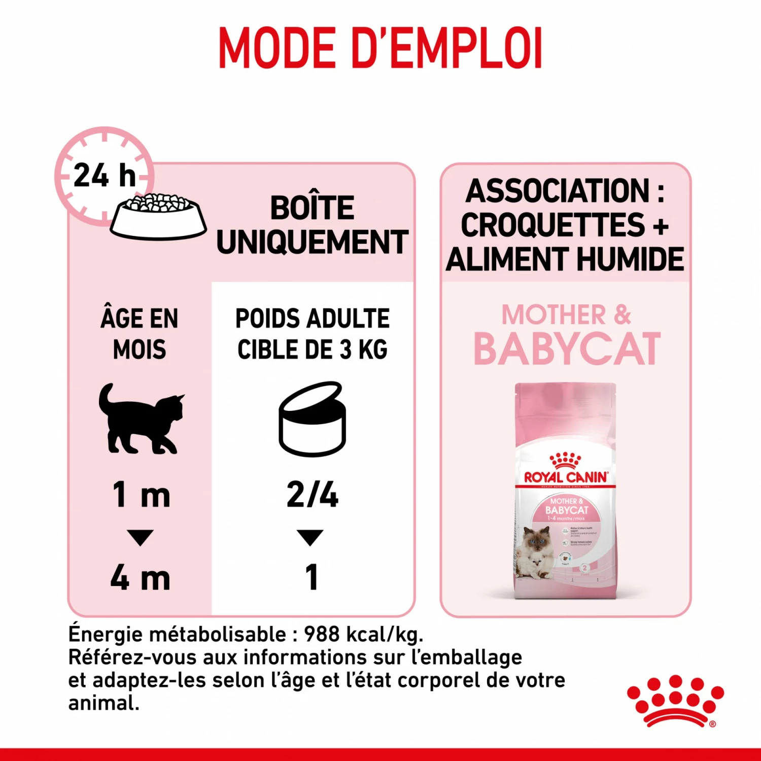 ROYAL CANIN® Mother & Babycat est adapté aux besoins nutritionnels de la mère et de ses chatons. Elle convient aux chattes gestantes ou allaitantes ainsi qu’aux chatons du 1er âge (de 1 à 4 mois).