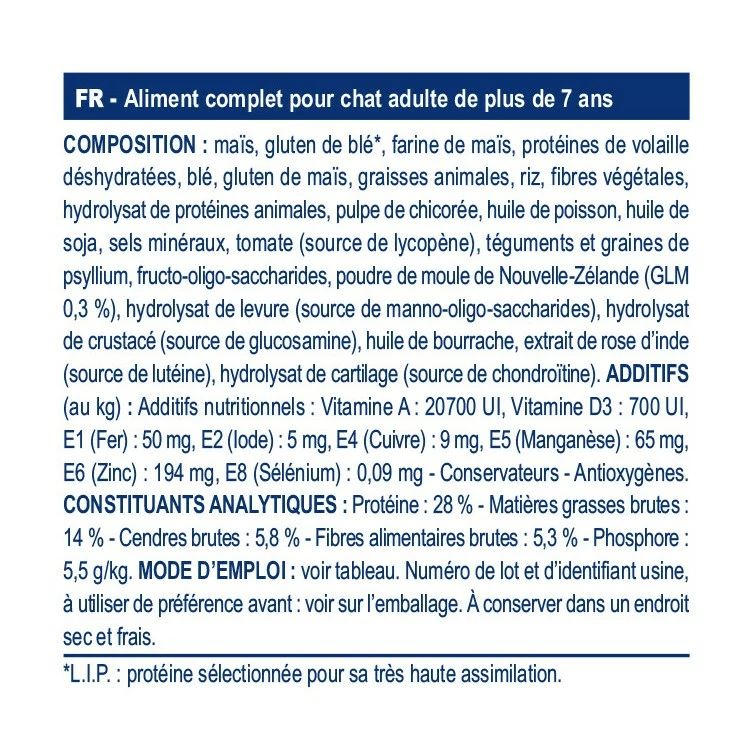 A partir de l’âge de 12 ans, le risque d’apparition d’insuffisance rénale devient de plus en plus important. C’est pour cette raison que cet aliment contient une teneur réduite en phosphore afin de préserver la fonction rénale.