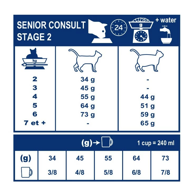 L’aliment Senior Consult Stage 2 / Early Renal permet également de limiter la formation de calculs urinaires et la prise de poids chez les mâles et femelles stérilisées de plus de 10 ans.