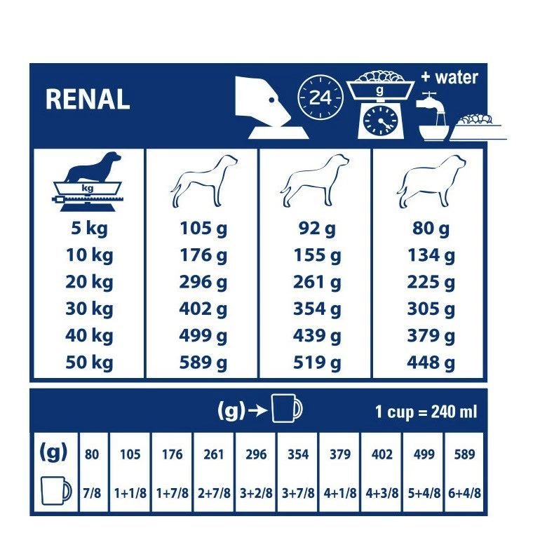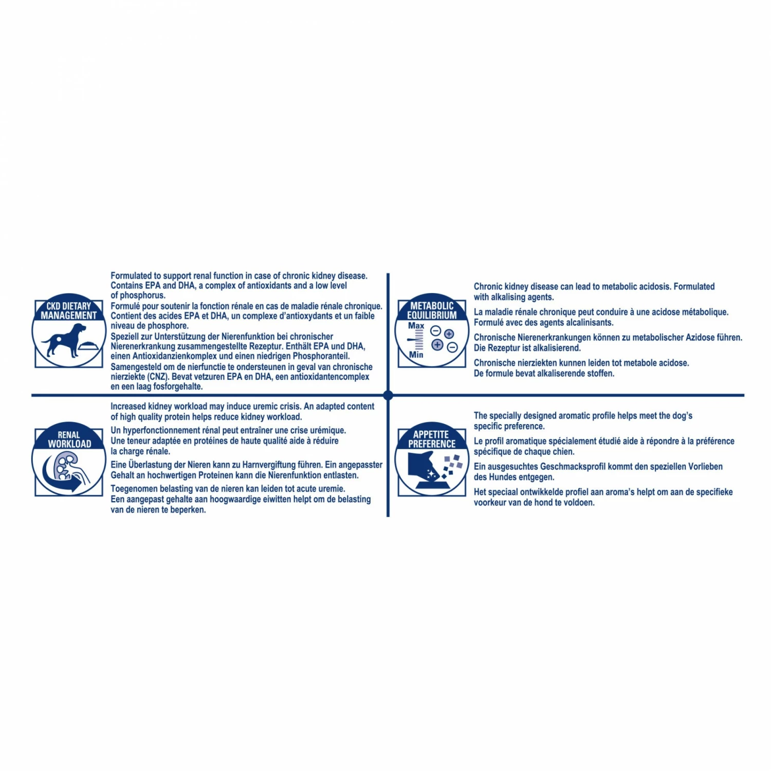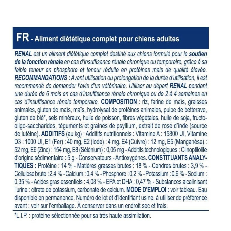L’aliment Royal Canin Renal est formulé pour les chiens adultes souffrant d’IRC (insuffisance rénale chronique), d’insuffisance hépatique diagnostiquée ou d’urolithiase (calculs d’oxalate de Ca, calculs d’urate).