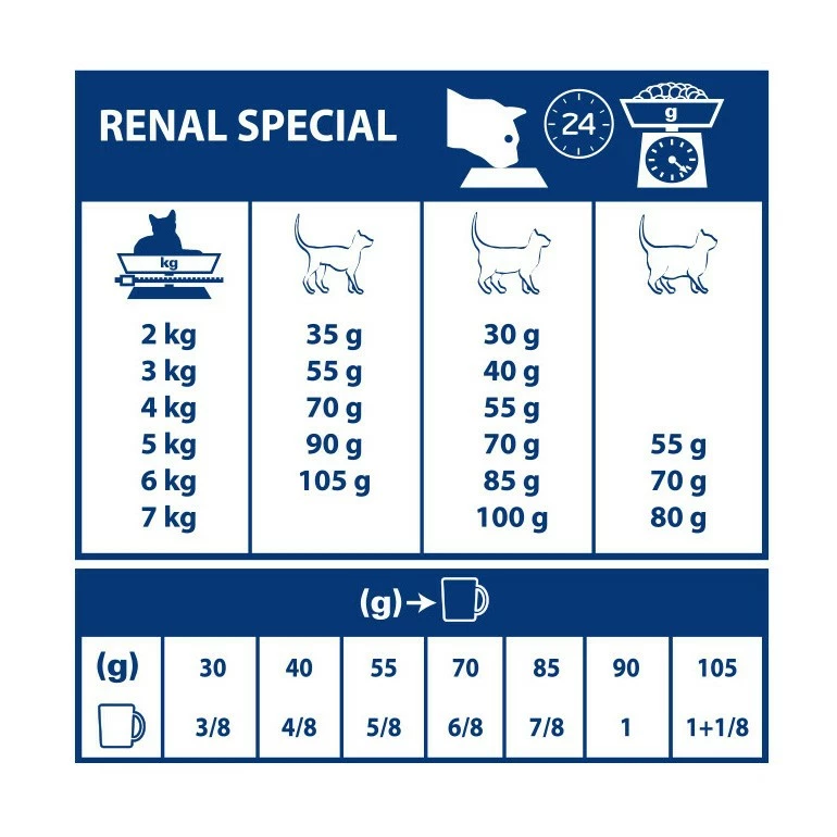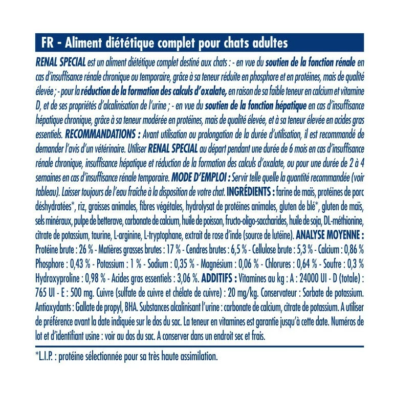 Les croquettes Royal Canin Renal Special sont formulĂ©es pour les chats adultes souffrant d’insuffisance rĂ©nale chronique (IRC), d’urolithiase (calculs d’oxalate ou d’urate) ou d’encĂ©phalose hĂ©patique diagnostiquĂ©e :