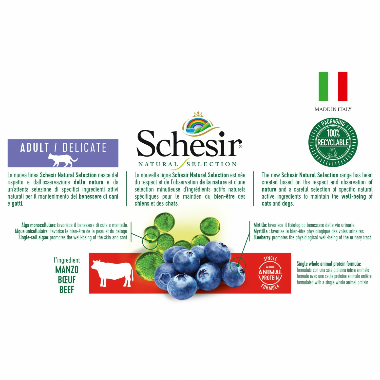 Les croquettes Schesir Natural Selection Adult Delicate sont spécialement élaborées pour les chats adultes à la peau sensible.