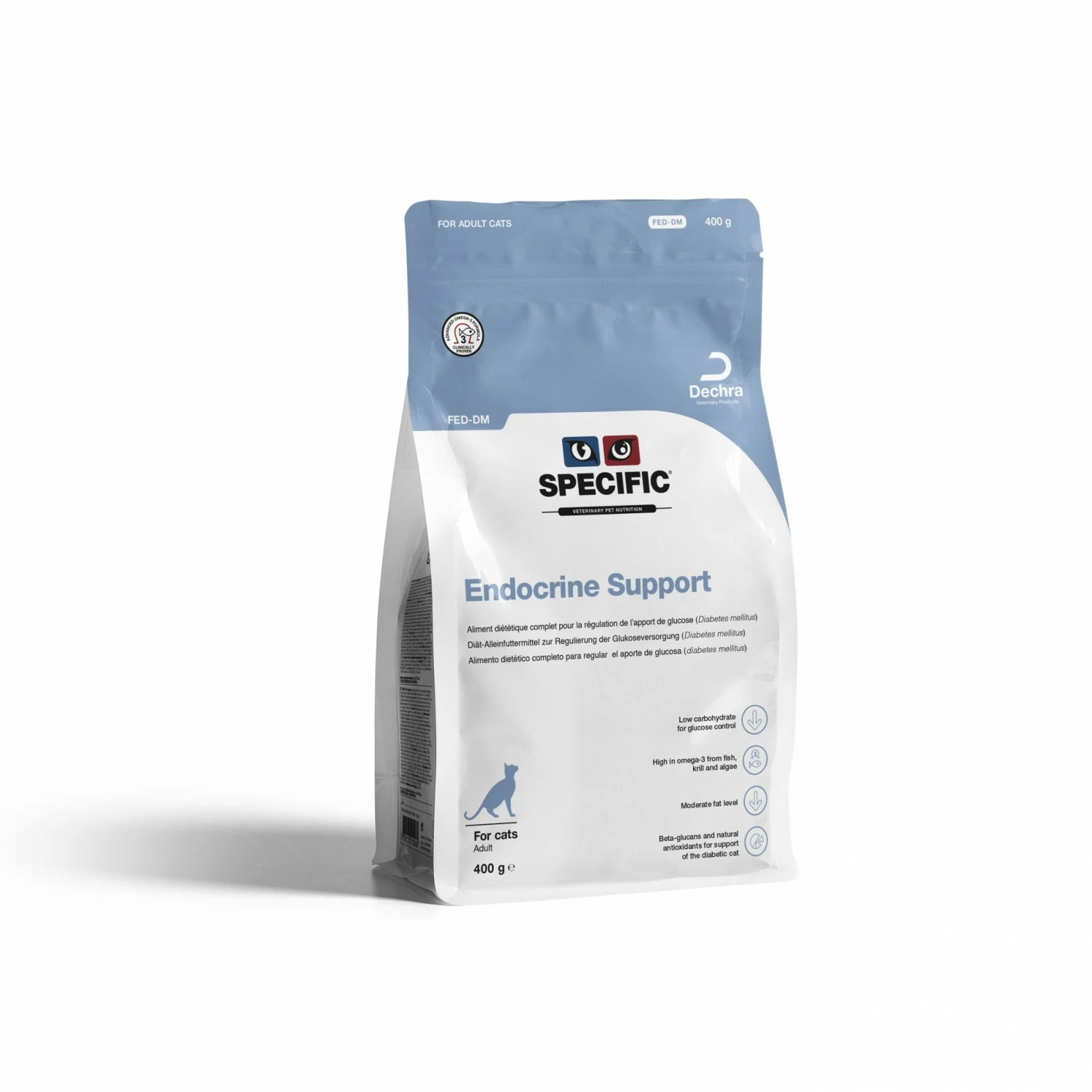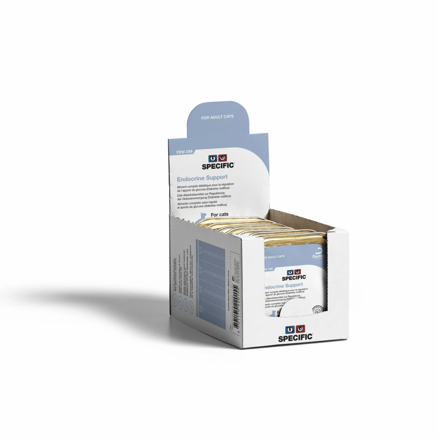 Les aliments SPECIFIC Endocrine Support FED-DM et FEW-DM sont des aliments diététiques complets pour chat pour la prise en charge du diabète. Ils existent en croquettes et en pâtée.
