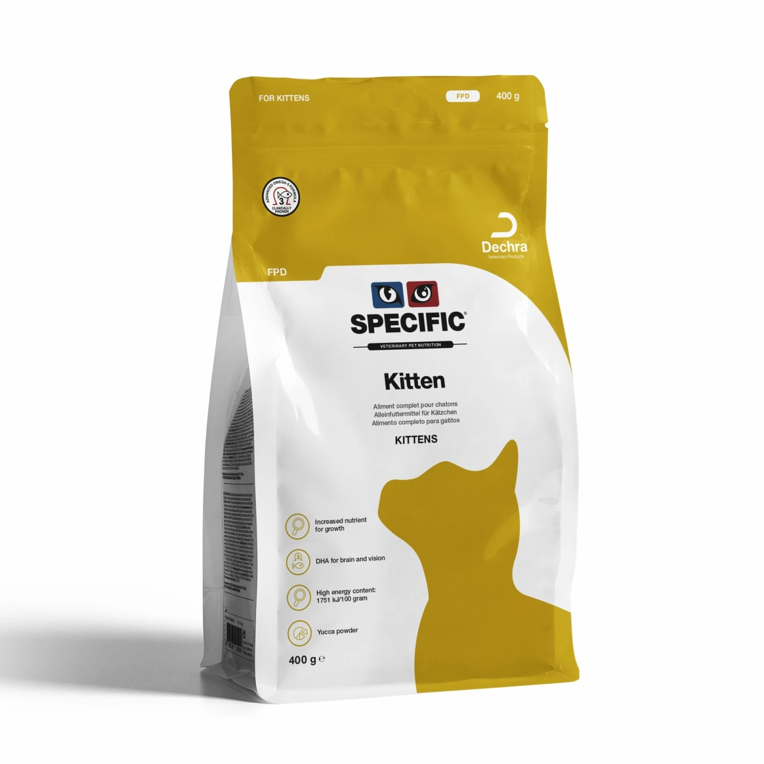 Les croquettes SPECIFIC Kitten FPD sont particulièrement adaptées aux chatons en croissance pendant la période qui s’étend du sevrage jusqu’à l’âge de 8-12 mois (selon la race ou une éventuelle stérilisation).