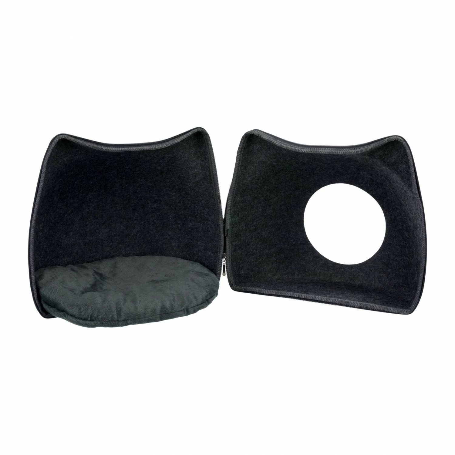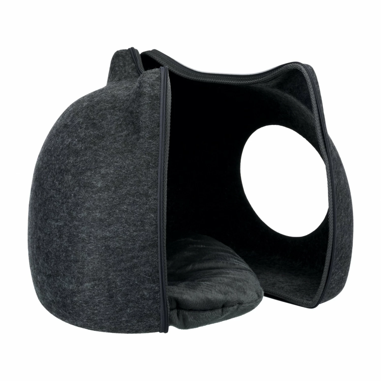 Si votre boule de poils est d’humeur plus sociable, vous avez la possibilité de l’ouvrir comme un médaillon grâce à sa fermeture éclair enveloppante pour en faire un agréable coin repos.